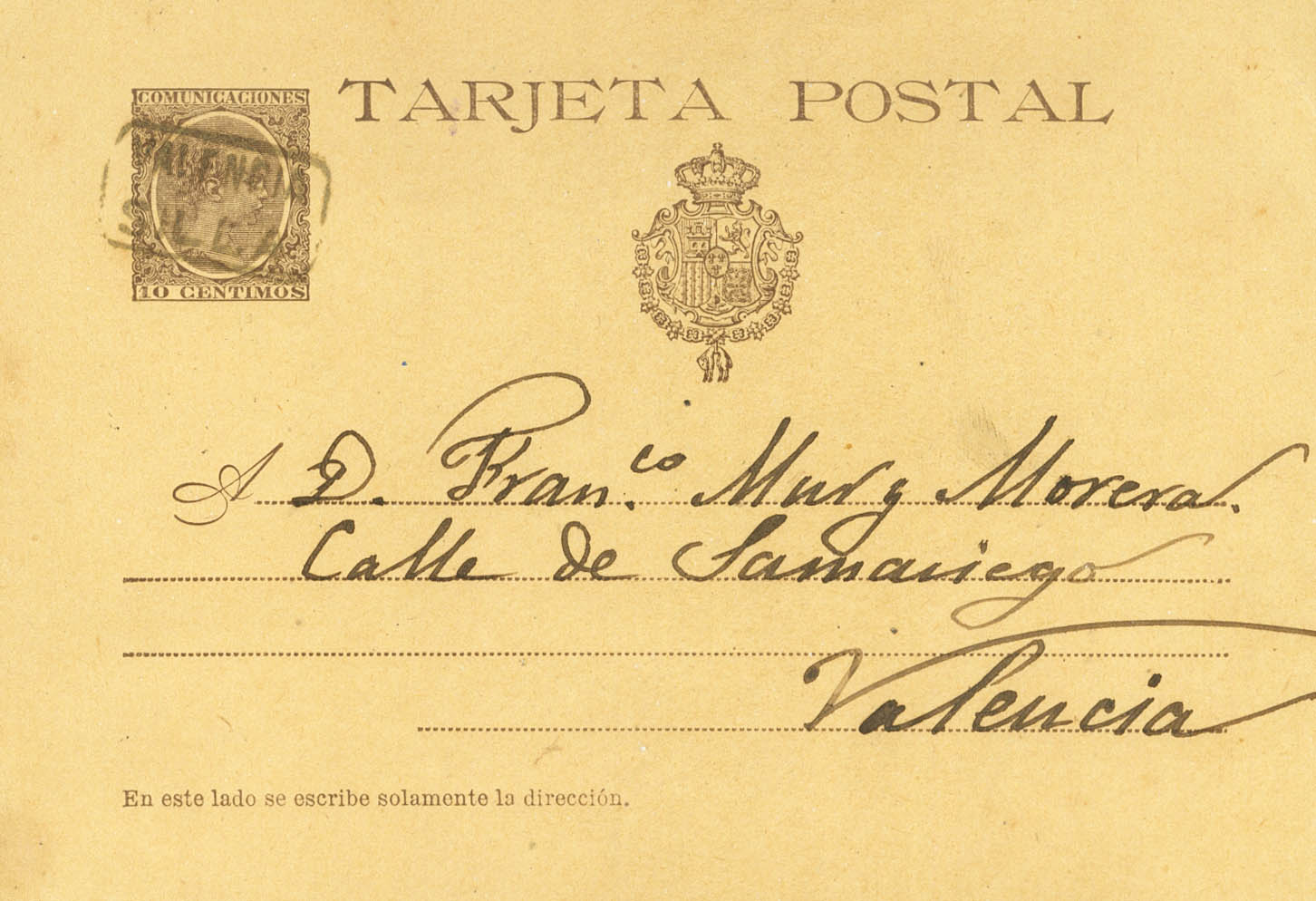 EP27. 1894. 10 chestnut cts on Postal Stationery Card from SILLA to VALENCIA. Postmark VALENCIA / SILLA postmark. MAGNIFICENT.