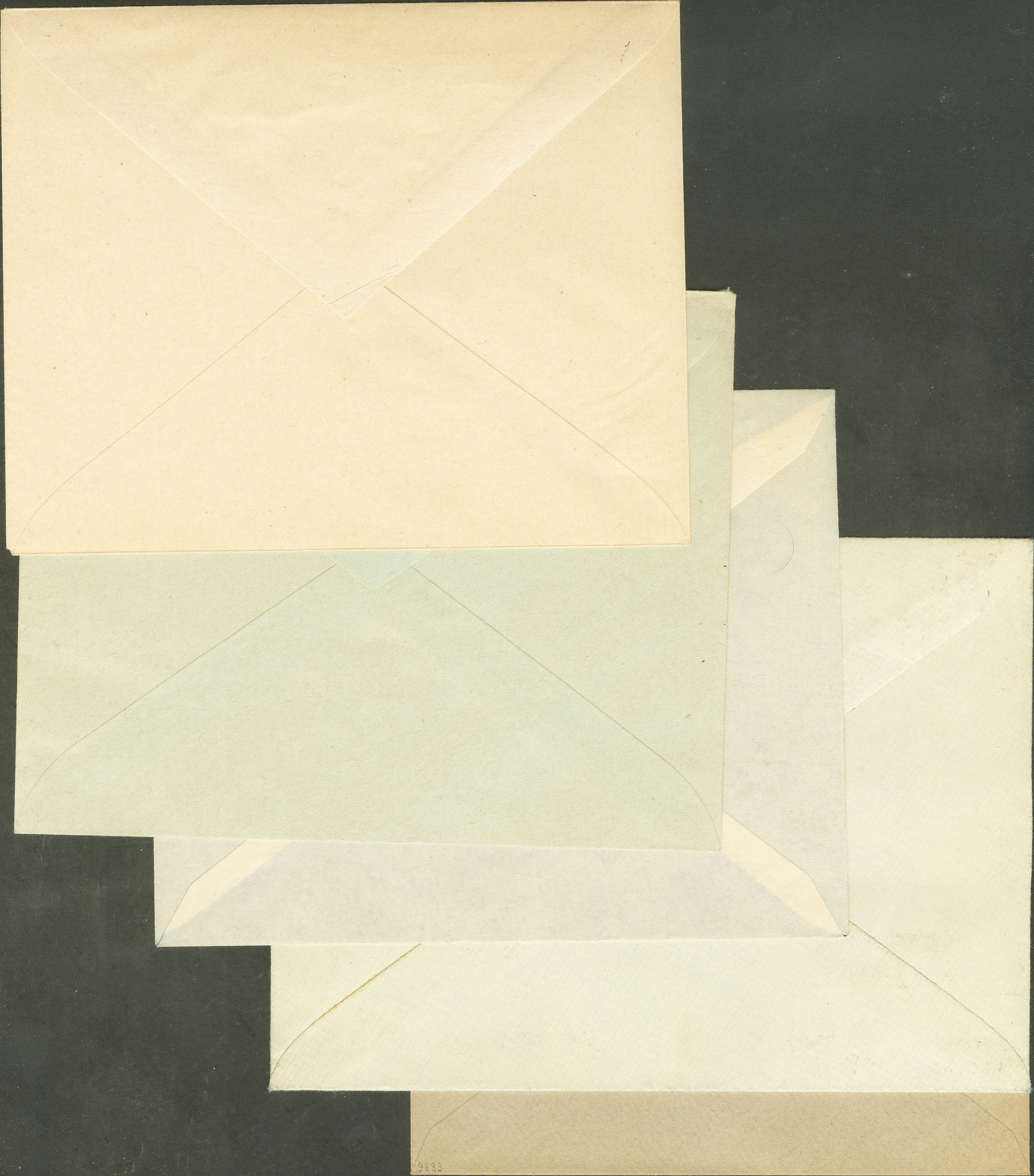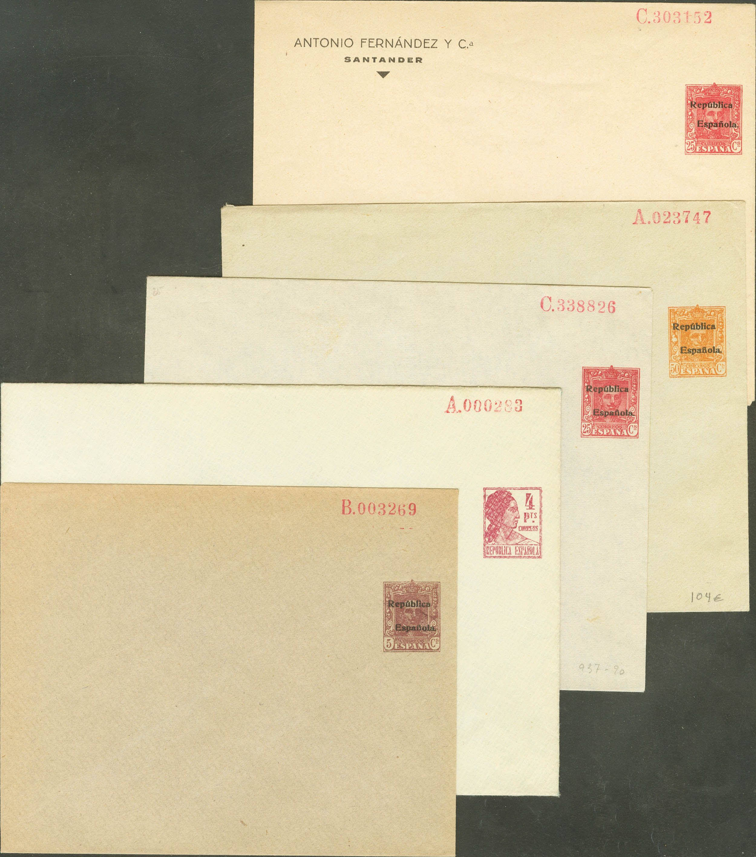 English (★) EP925,EP937,EP939,EP970,EP1313. 1931. Set of five Private Postal Envelopes, four from Vaquer with REPUBLICA ESPAÑOLA surcharge (one with ANTONIO FERNANDEZ Y CIA letterhead) and one of 4 pts pink from Matrona. MAGNIFICENT. (Láiz 2006, 640 Euros)