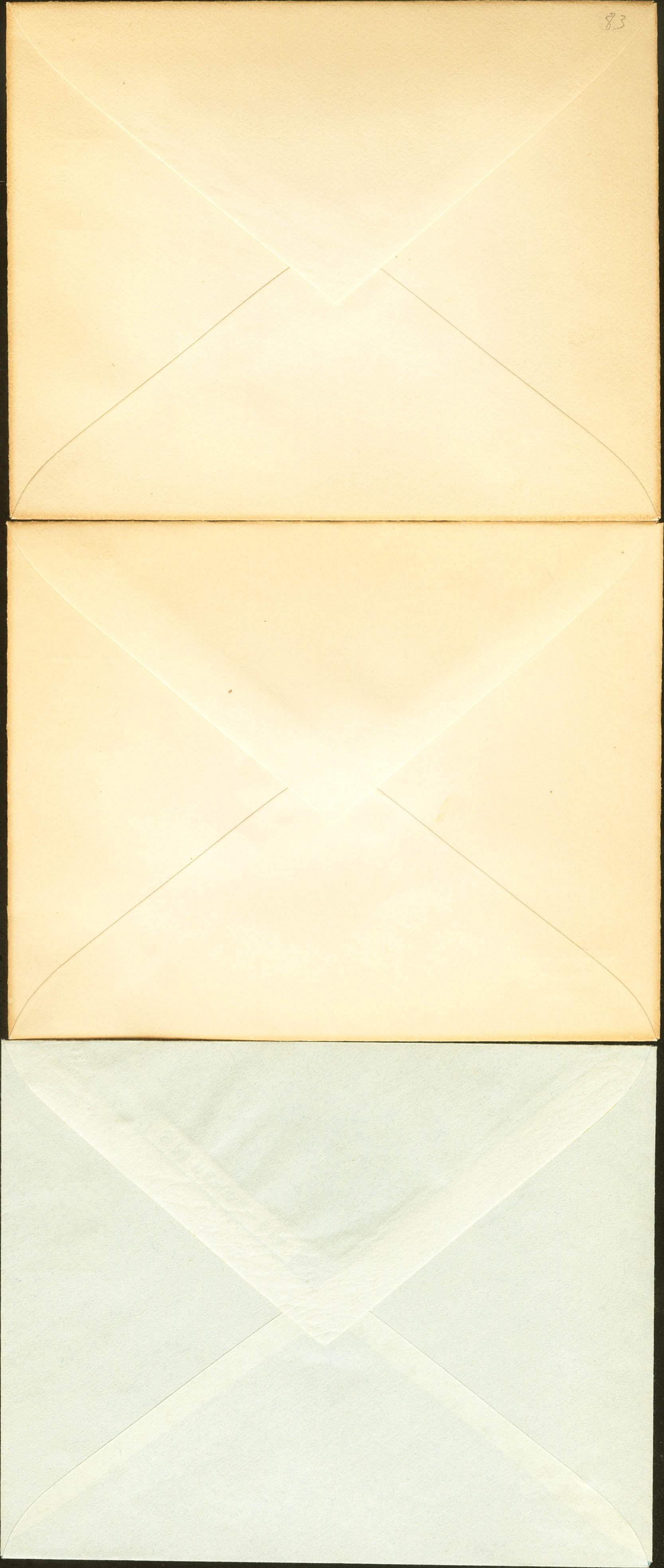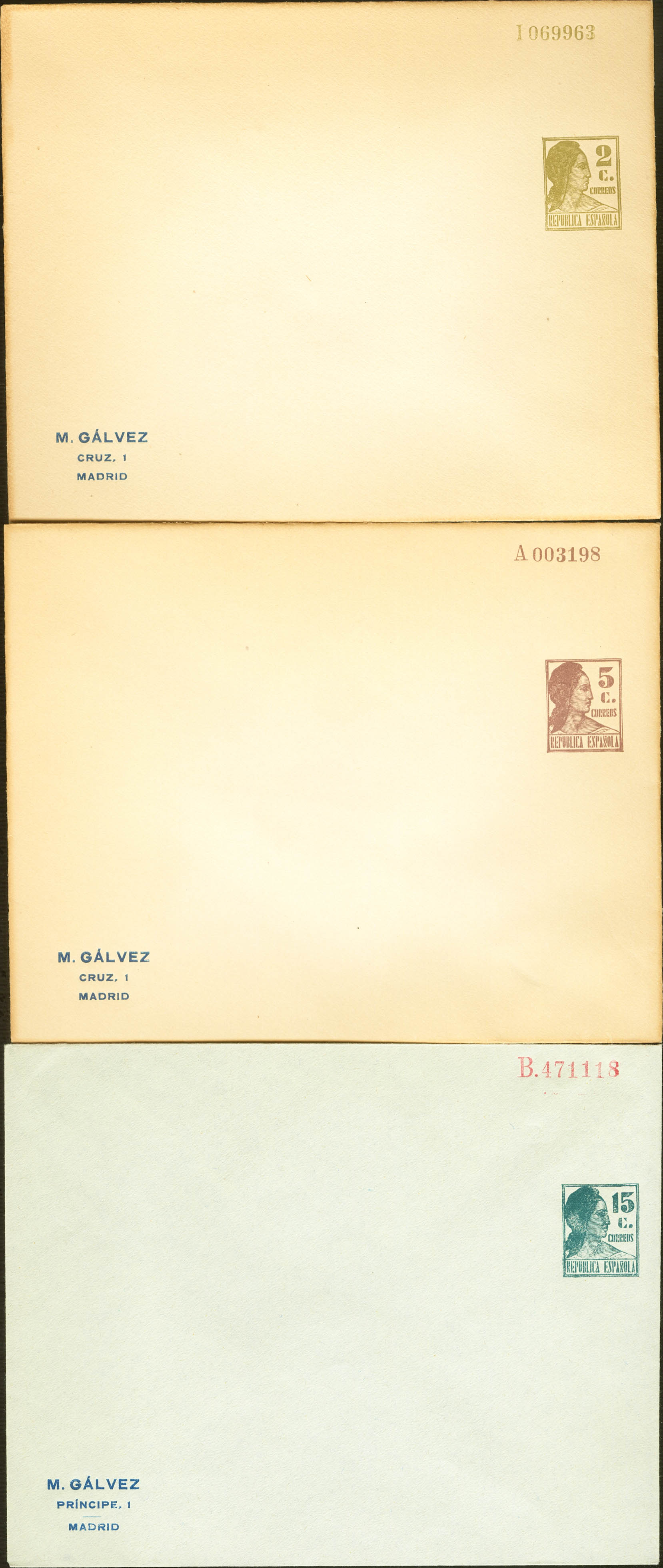 (★)1932. Set of three Private Postal Envelopes M. GALVEZ the values of 2 cts olive green, 5 cts brown violet and 15 cts blue green. MAGNIFICENT. (Láiz 2006 Nº1139, 1163, 1185, 220 Euros)