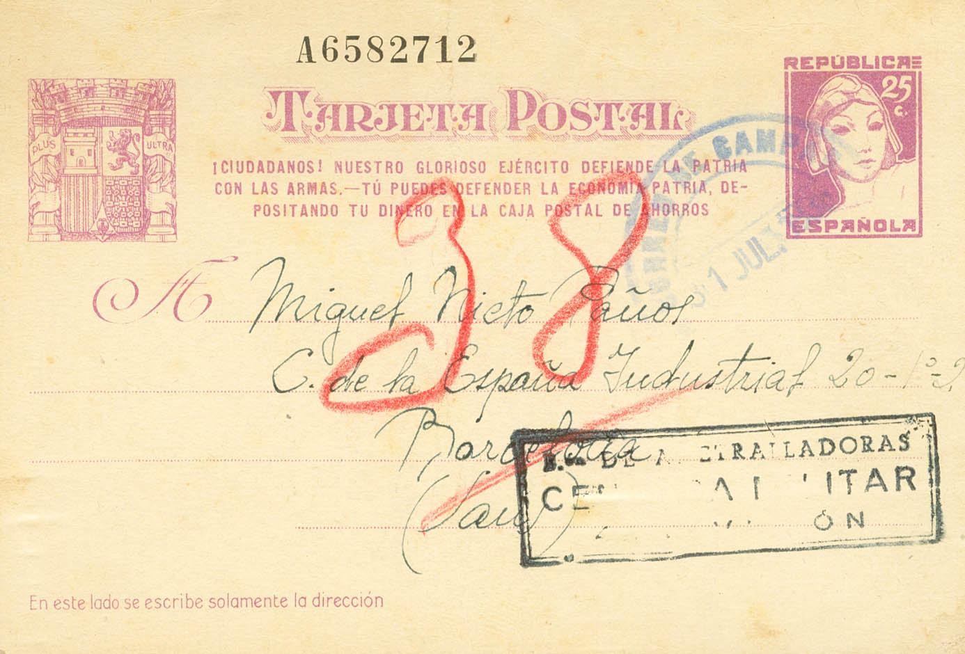 EP80. 1938. 25 cts lilac on Postcard Stationery Card "CITIZENS!" directed to BARCELONA. Postmark CORREO DE CAMPAÑA, in blue and on the front mark BON.DE AMETRALLADORAS / CENSURA MILITAR, in black. MAGNIFICENT.
