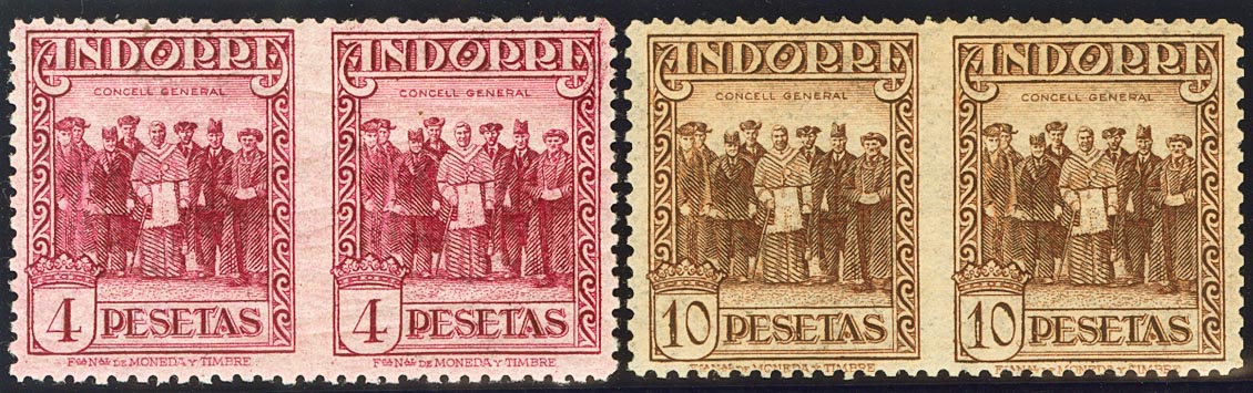 25/26sph. 1929. 4 pts pink carmine and 10 pts chestnut, pairs. IMPERFORATE BETWEEN SEALS. MAGNIFICENT AND RARE. Edifil 2019: +1,550 Euros