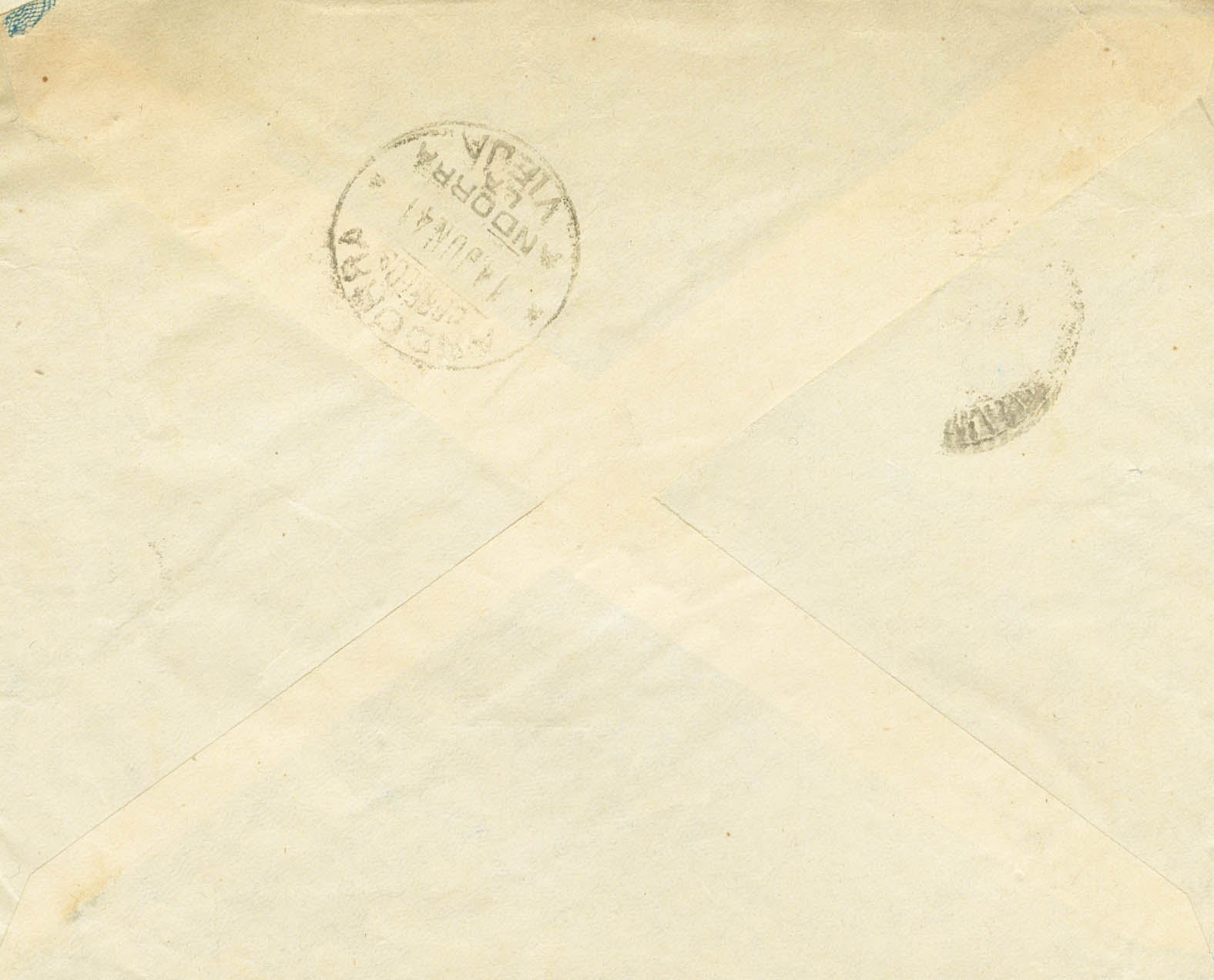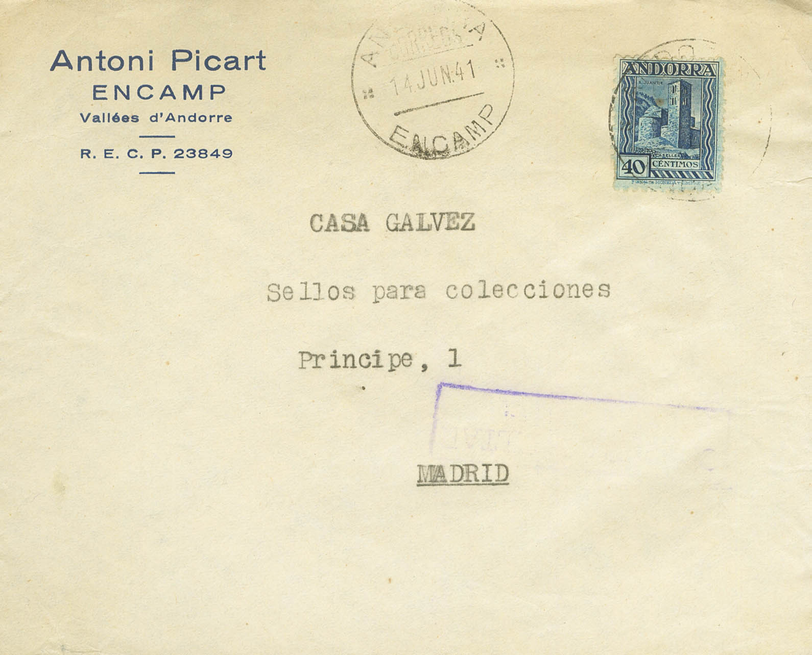 37. 1941. 40 cts blue. ENCAMP to MADRID. On the reverse ANDORRA / LA / VIEJA transit and partial arrival. MAGNIFICENT AND VERY RARE, ONLY EIGHT HUNDRED OF THIS STAMP WERE SOLD, NO MORE THAN A DOZEN POSTMARKED AND NO MORE THAN FIVE LETTERS ARE KNOWN.
