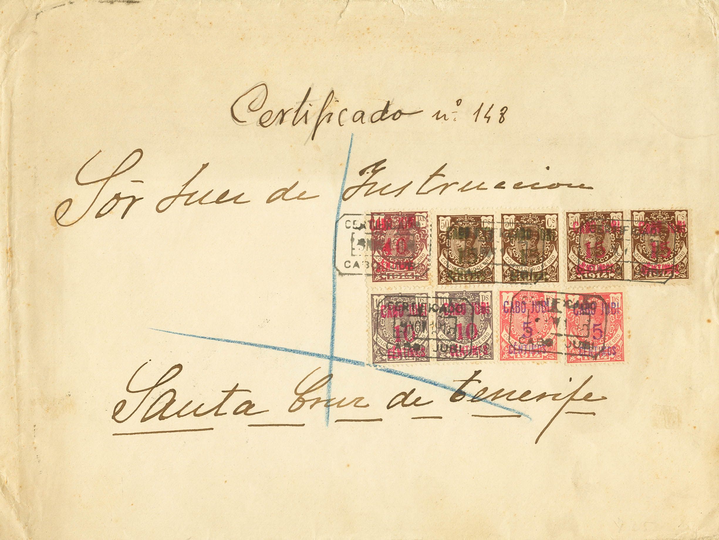 1/4. 1916. 10 cts over 4 pts, 15 cts over 50 pair black-green cts, 15 cts over 50 pair violet cts, 10 cts over 10 pair pts and 5 cts over 4 pts two stamps. Certificate from CABO JUBY to SANTA CRUZ DE TENERIFE (CANARY ISLANDS. Arrival on the back. MAGNIFICENT AND RARE. Cert. GRAUS.