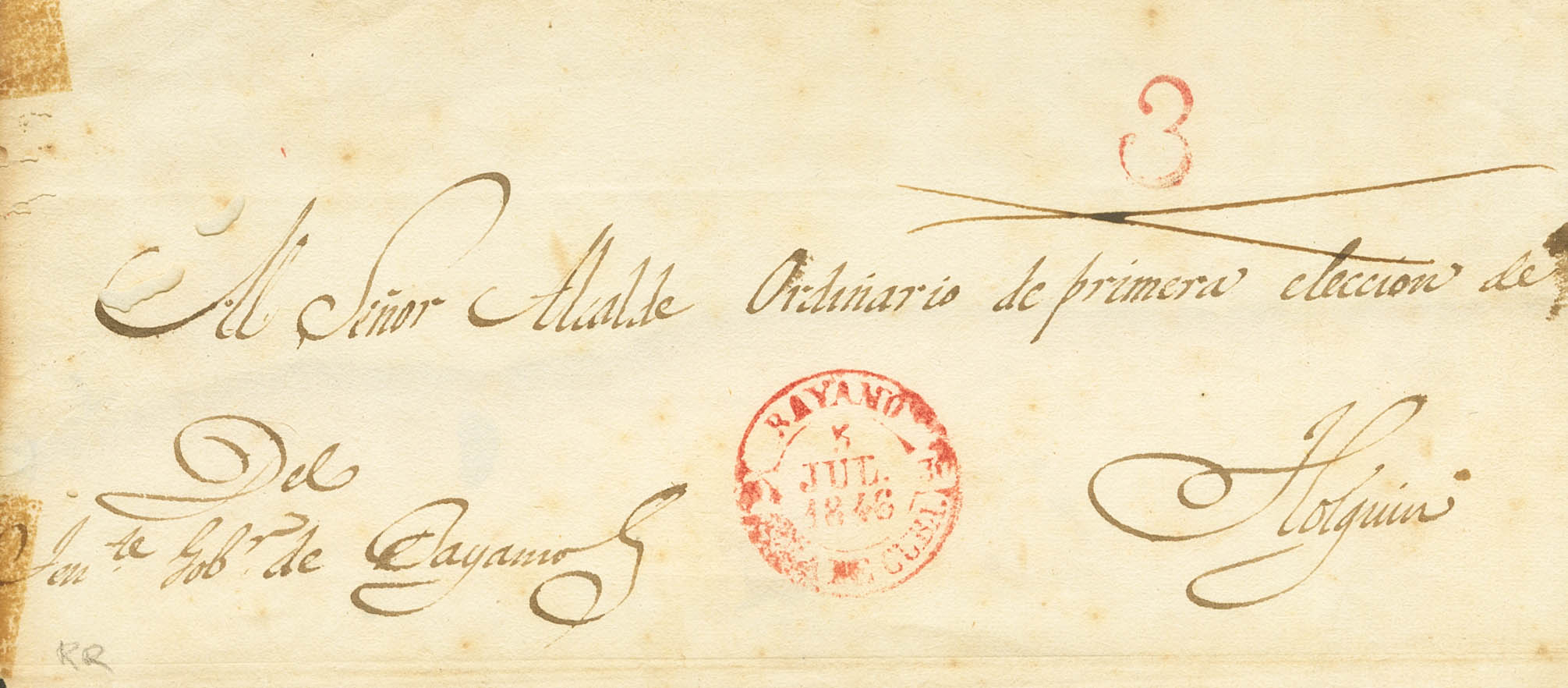 1846. BAYAMO to HOLGUIN. Baeza BAYAMO / ISLAND OF CUBA, in red. MAGNIFICENT AND VERY RARE.