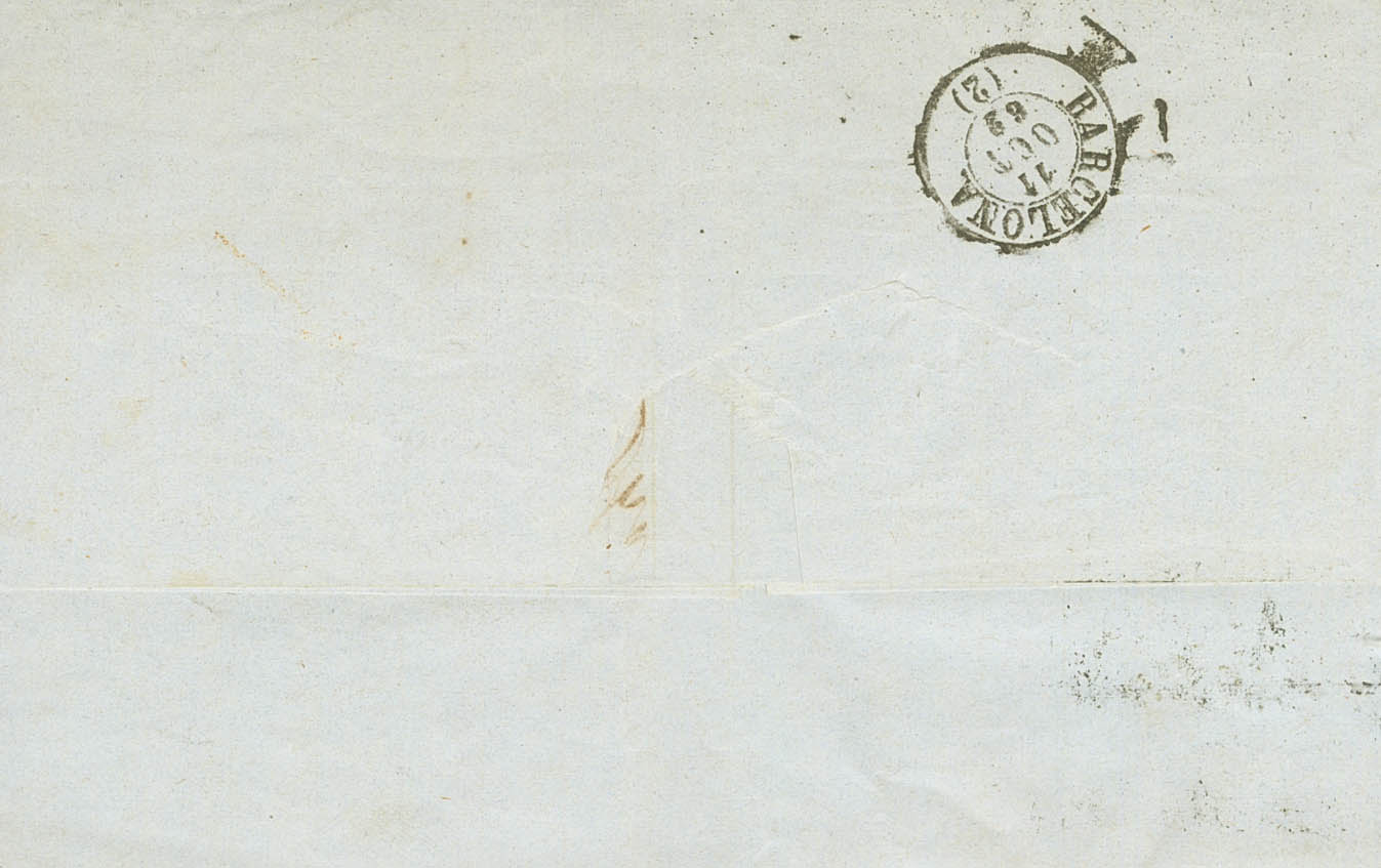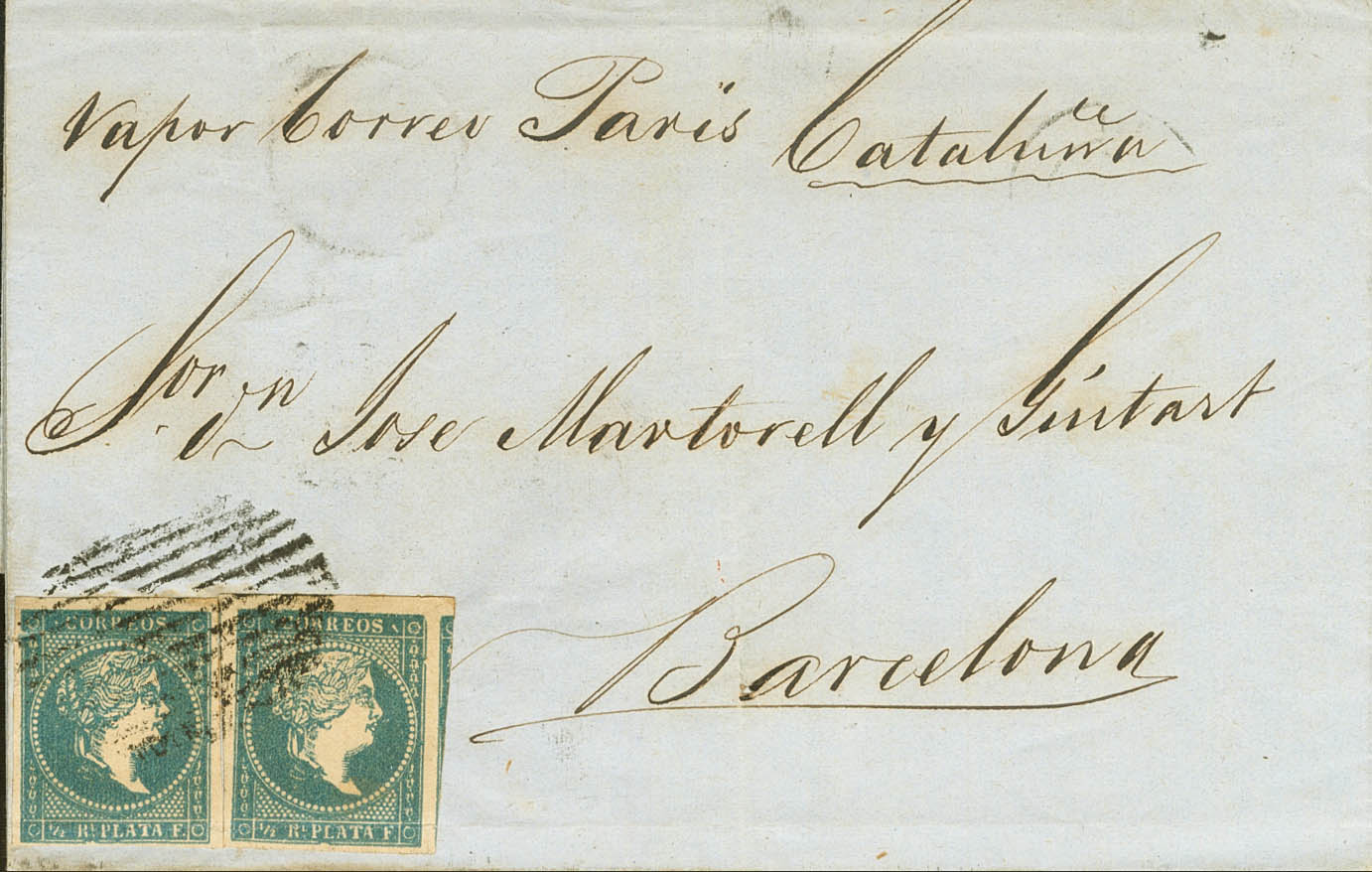 1862. ½ real blue from Antilles, two stamps. HAVANA to BARCELONA. Postmark PARRILLA and on the front handwritten annotation "Vapor Correo París" from the Antonio López y Cía. MAGNIFICENT.