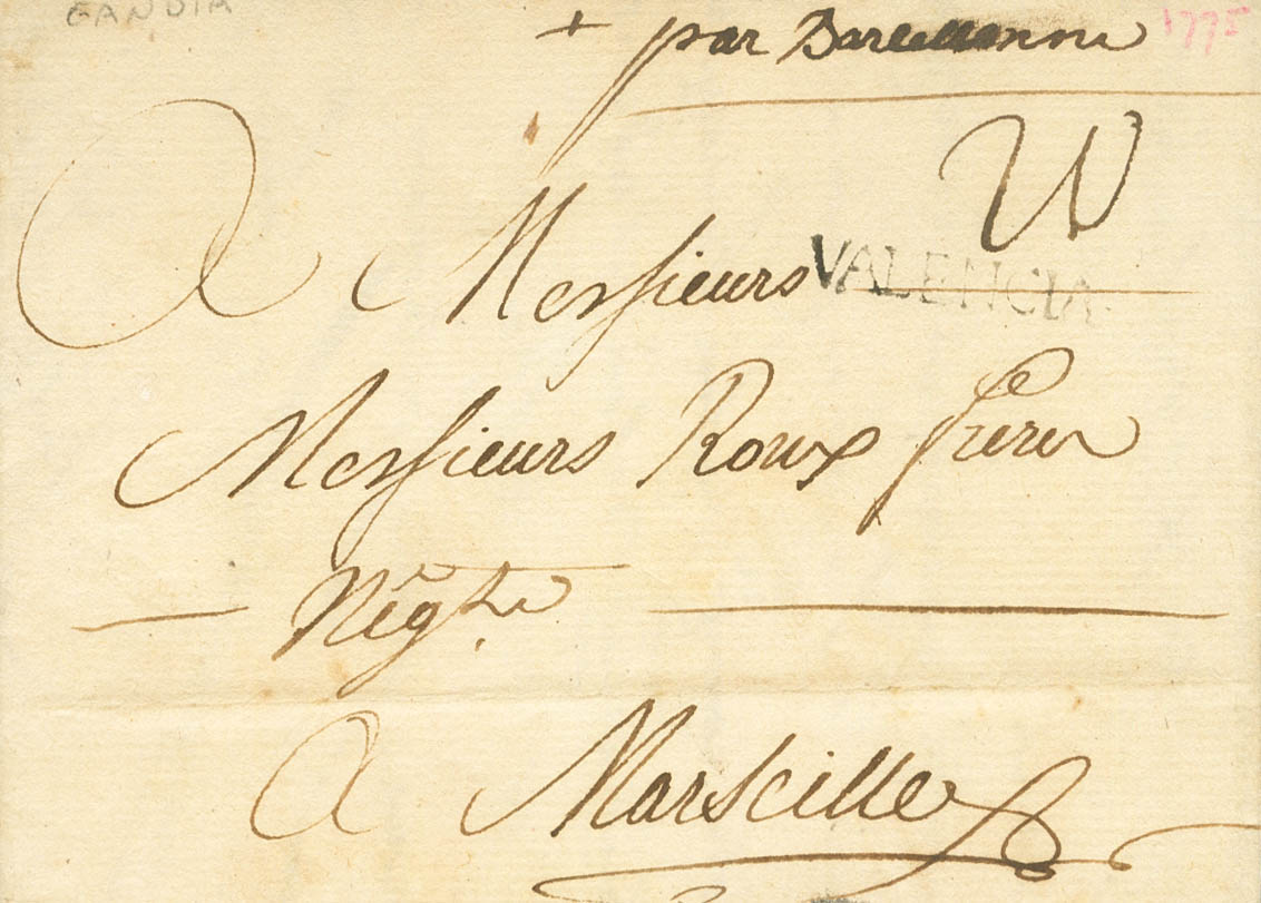 1775. GANDIA (VALENCIA) to MARSEILLE (FRANCE). Brand VALENCIA, from Gandía (PE1) 2004 edition. MAGNIFICENT AND RARE.