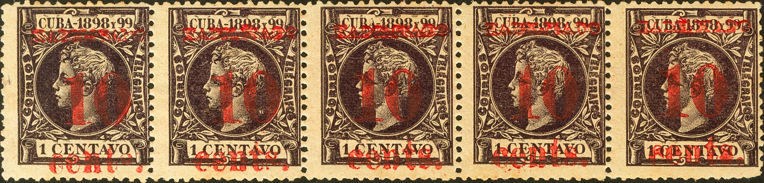 English ★ 15(4), 15hp. 1898. 3 cents on 1 black cent, strip of five. 4th Edition, a stamp NUMBER "1" OF "10" BROKEN (Position 4). MAGNIFICENT AND RARE. Cert. ECHENAGUSIA.