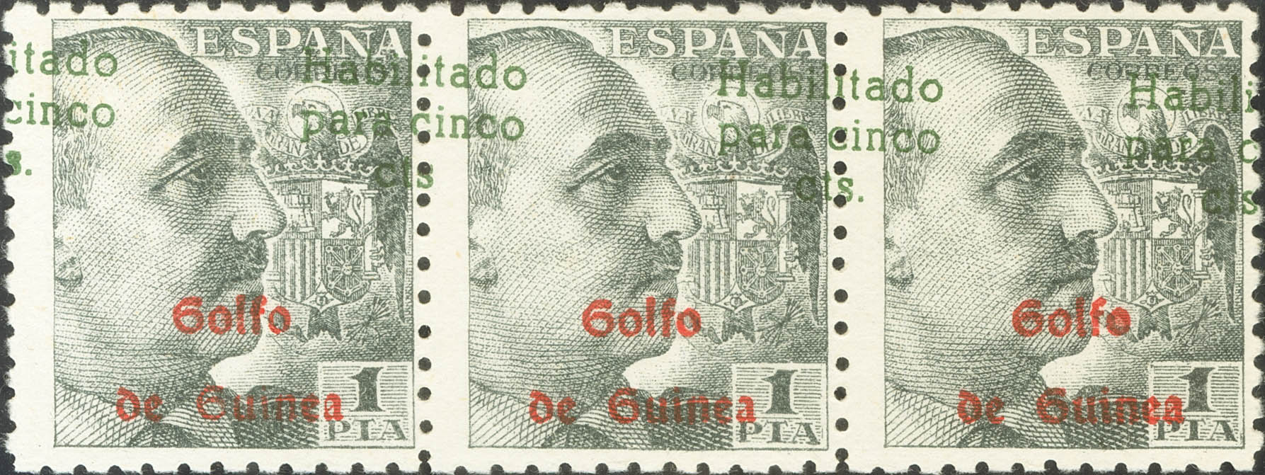 ★★ 273 Ah. 1949. 5 cts on 1 black pts, strip of three. ENABLED OVERLOAD DISPLACED "ON HORSE" (it so happens that it is the one that appears photographed in the specialized Edifil catalogue). MAGNIFICENT AND RARE. Edifil 2018: +270 Euros