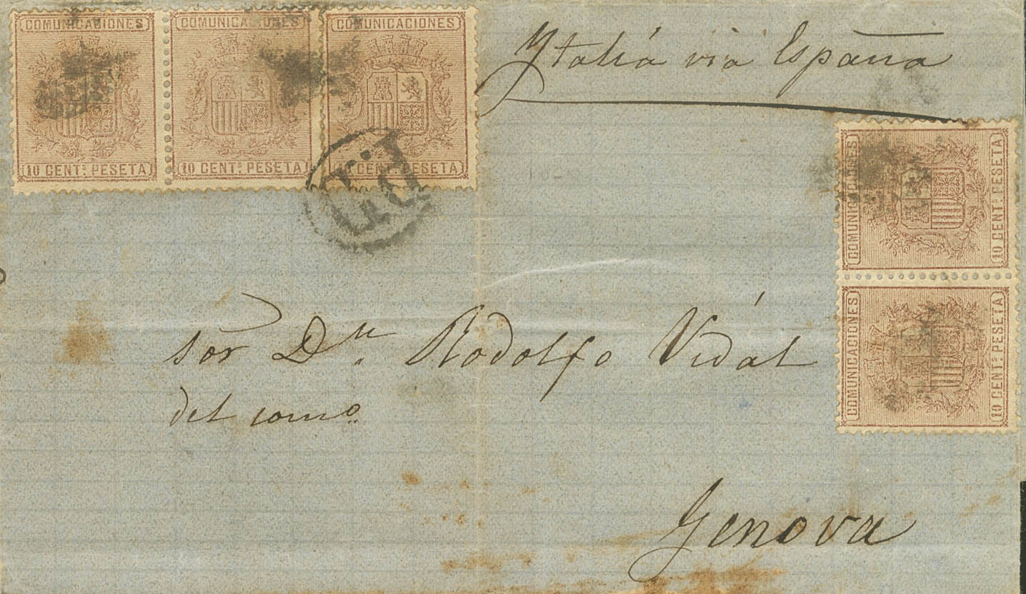 English 153(5). 1874. 10 chestnut cts, five stamps. TANGIER (MOROCCO) to GENOA (ITALY). Franked with 50 cts of Spanish stamps as required, as there are no own stamps in Morocco, according to the rate in force since July 1868 by land. MAGNIFICENT AND EXTRAORDINARY RARE, NO MORE THAN TEN KNOWN LETTERS FROM MOROCCO WITH SPANISH STAMPS.