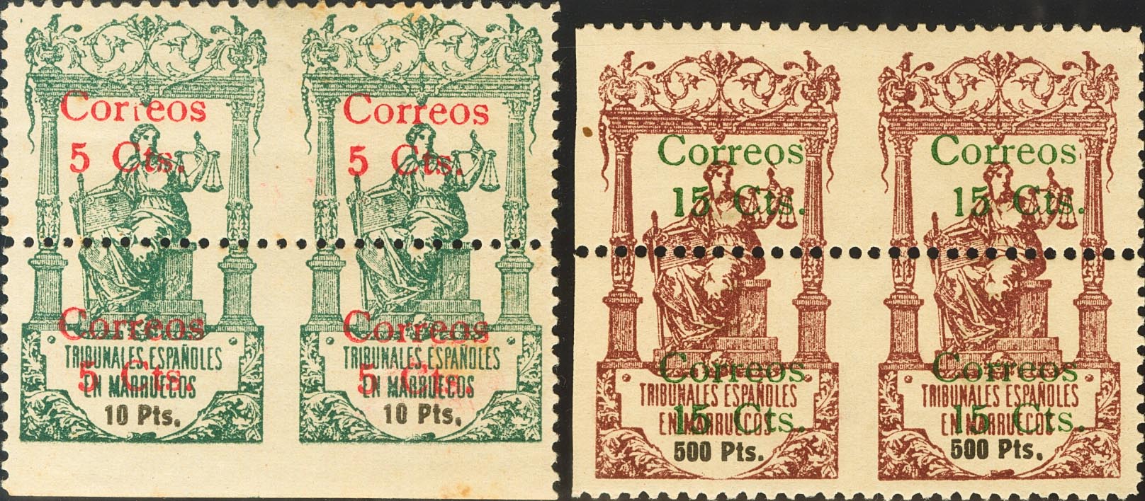 ★ 69sv, 73sv. 1920. 5 cts over 10 green pts and 15 cts over 500 brown carmine pts, in pairs. IMPERFORATE BETWEEN SEALS. MAGNIFICENT. Edifil 2018: 98 Euros