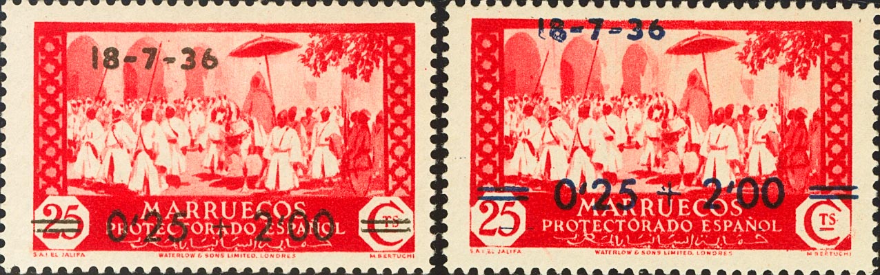 ★ 161, 161hcc. 1936. 0´25 + 2´00 on 25 red cts, two stamps. One COLOR CHANGE ON OVERLOAD, in blue. MAGNIFICENT. Edifil 2018: 96 Euros