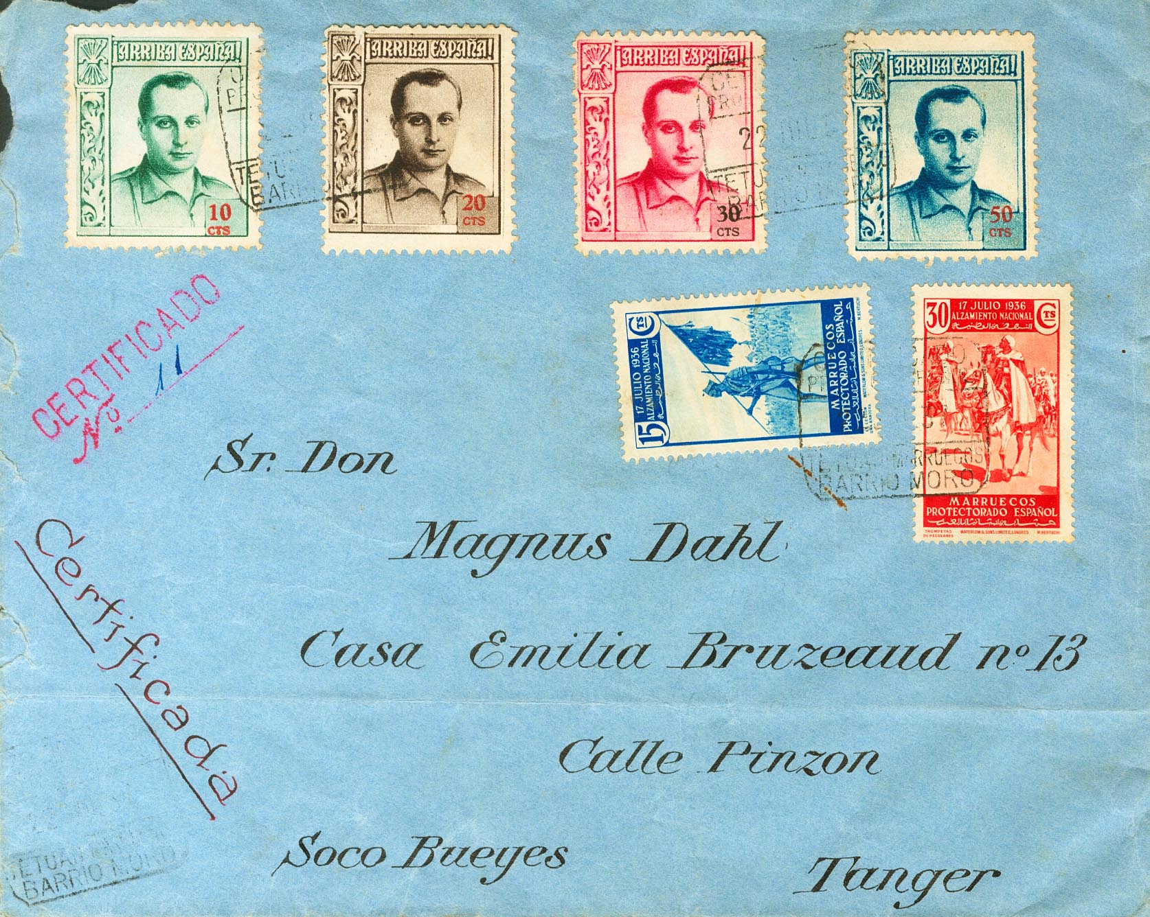 173. 1937. 15 cts blue, 30 cts red and NON-ISSUED series of Charity of Spain. Certificate from TETUAN to TANGIER. On the back arrival. MAGNIFICENT AND RARE POSTAGE.