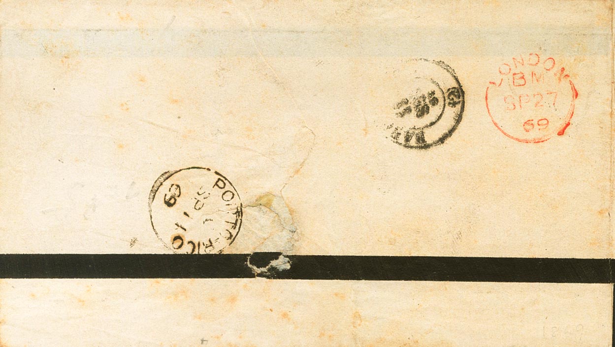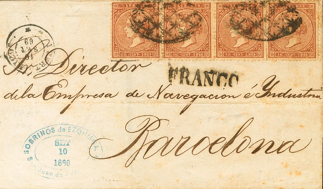 Ant. 16(4). 1869. 10 cts yellow chestnut, four stamps. SAN JUAN to BARCELONA. Postmark GRILLA COLONIAL and on the front mark FRANCO. MAGNIFICENT AND RARE FOUR POSTAGE POSTAGE.