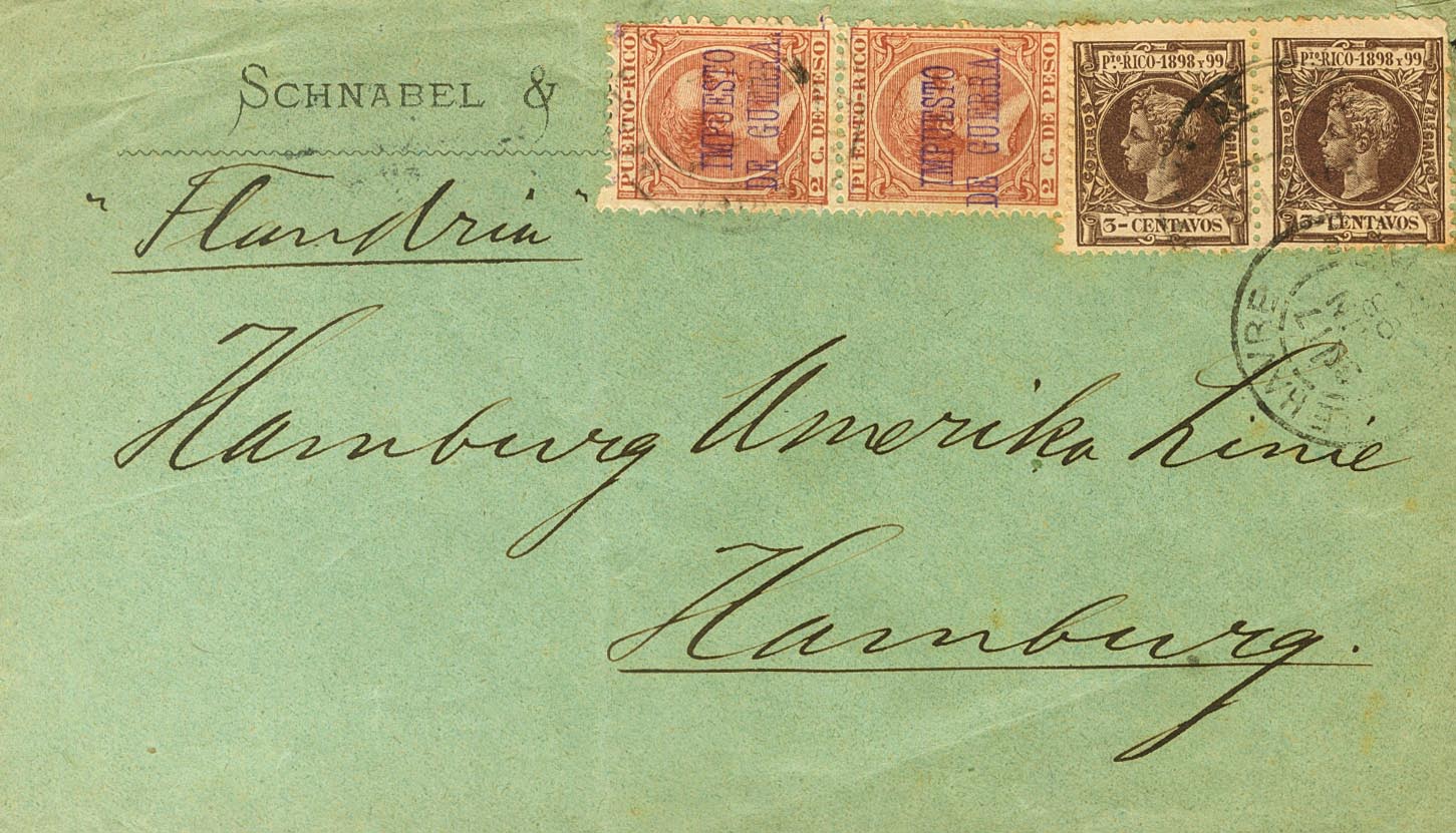 2(2), 137(2). 1898. 2 cents yellow chestnut, two stamps and 3 cents chestnut, two stamps. PUERTO RICO to HAMBURG. On the front handwritten steamship "Flandria" and LE HAVRE dater, on the back arrival. MAGNIFICENT AND VERY RARE. Cert. PHILATELIC FOUNDATION.