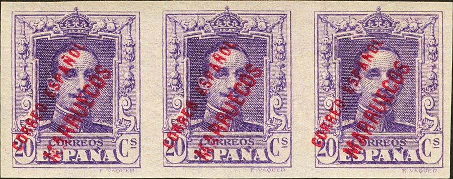 ★★ 21s(3). 1923. 20 violet cts, strip of three. WITHOUT DENTARTING. MAGNIFICENT. Edifil 2023: +153 Euros