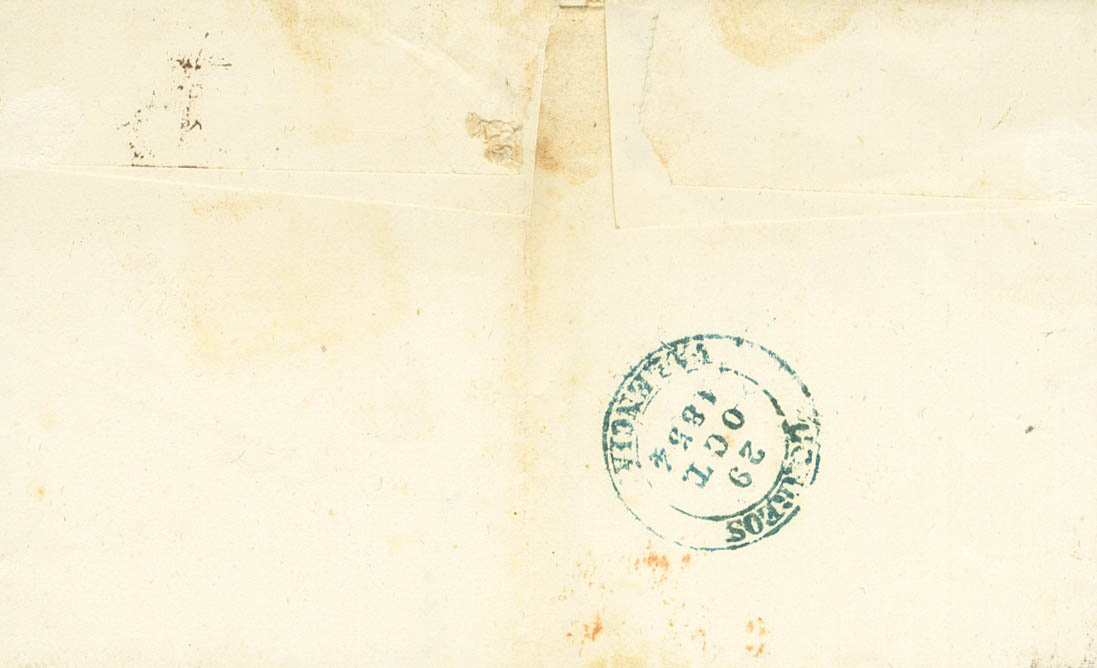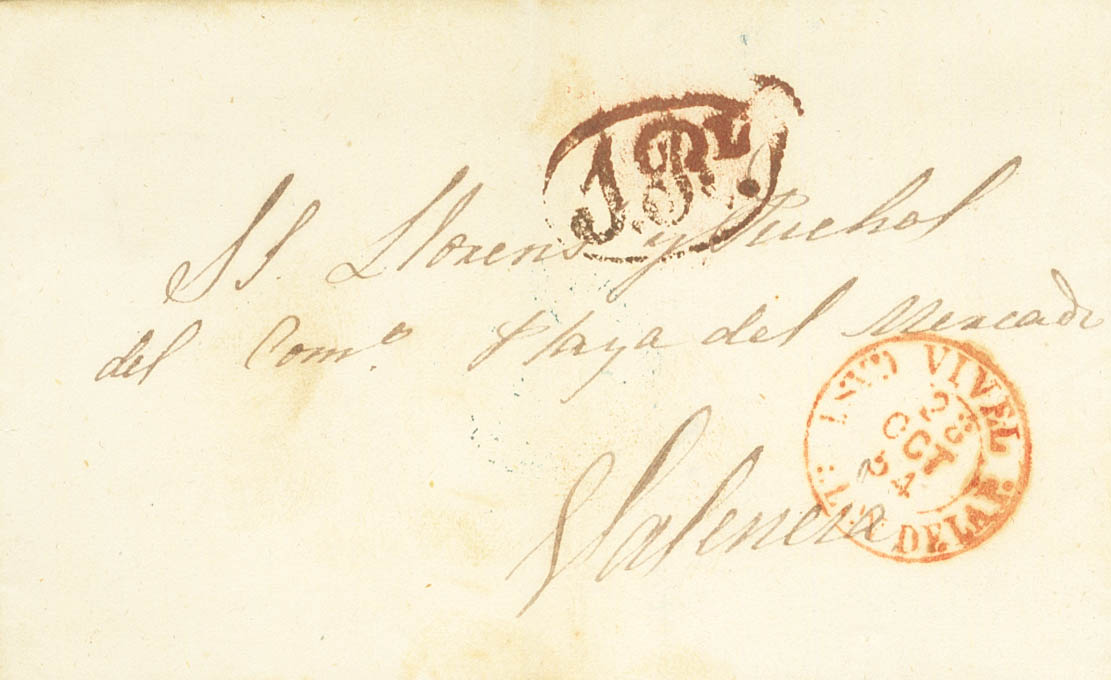 1854. VIVEL to VALENCIA. Dated VIVEL / CASTELLON DE LA P. (Type I), in red and on the back the arrival mark PORREOS / VALENCIA, in blue (PE42) 2004 edition. MAGNIFICENT.
