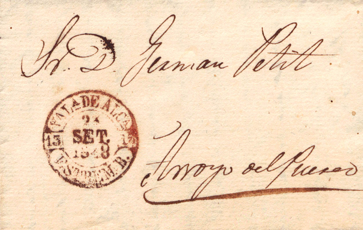 1848. VALENCIA DE ALCANTARA to ARROYO DEL PUERCO. Baeza VALª DE ALCª / ESTREM.B., in red. MAGNIFICENT AND VERY RARE.