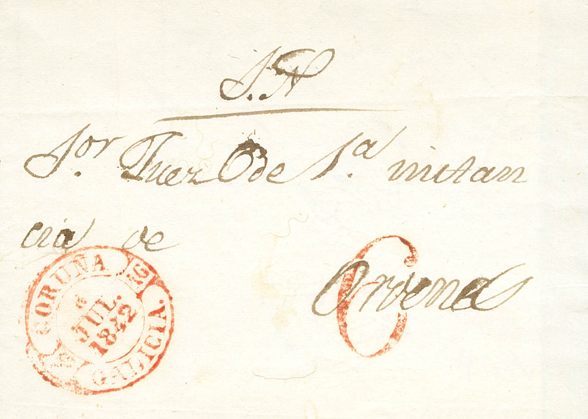 English 1842. LA CORUÑA to ORENSE. Baeza CORUÑA / 6-JUL-1842 / GALICIA, in red. MAGNIFICENT AND RARE, ONE OF THE FIRST KNOWN DATES OF USE OF THE BAEZA TYPE DATE IN LA CORUÑA.