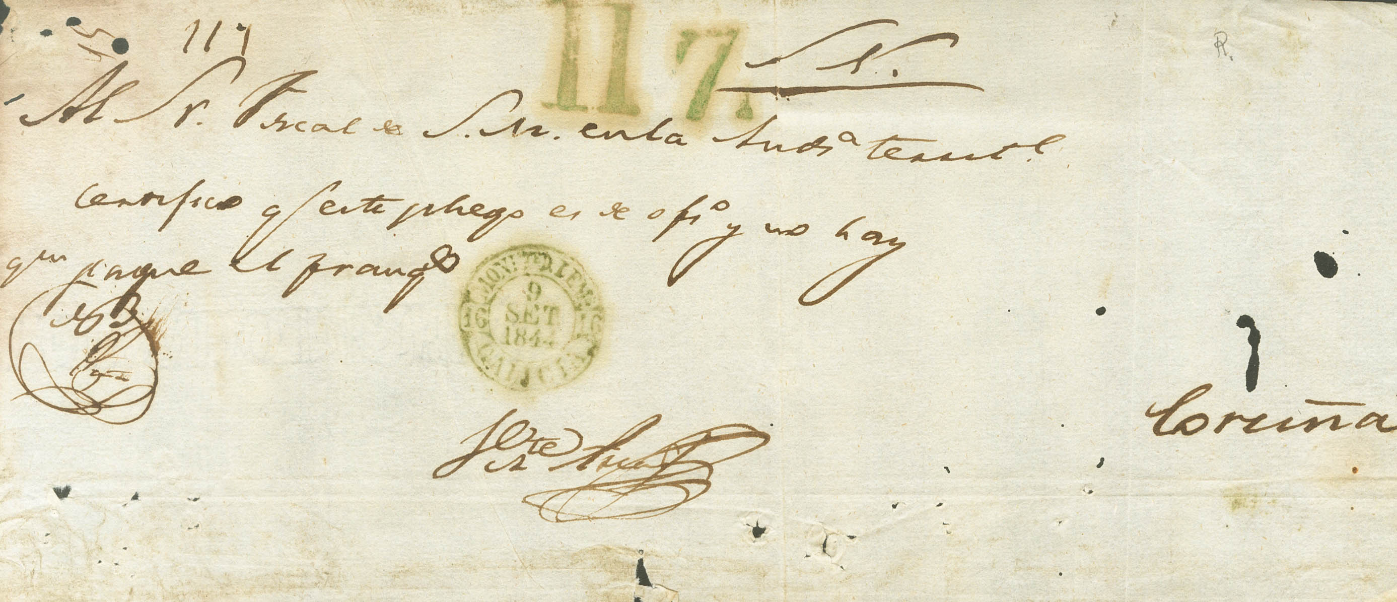 1844. Front of Judicial Escrow of MONFORTE DE LEMOS to LA CORUÑA. Baeza MONFTE D. LEMS / GALICIA, in green. MAGNIFICENT AND RARE.