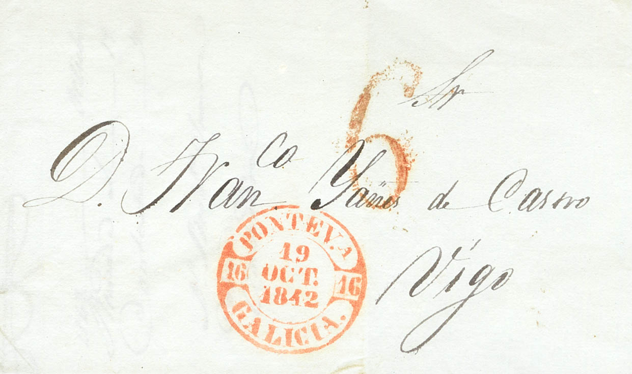 1842. PONTEVEDRA to VIGO. Baeza PONTEVA / 19-OCT-1842 / GALICIA, in red. MAGNIFICENT AND RARE, FIRST DATES OF USE OF THE BAEZA TYPE DATE IN PONTEVEDRA.