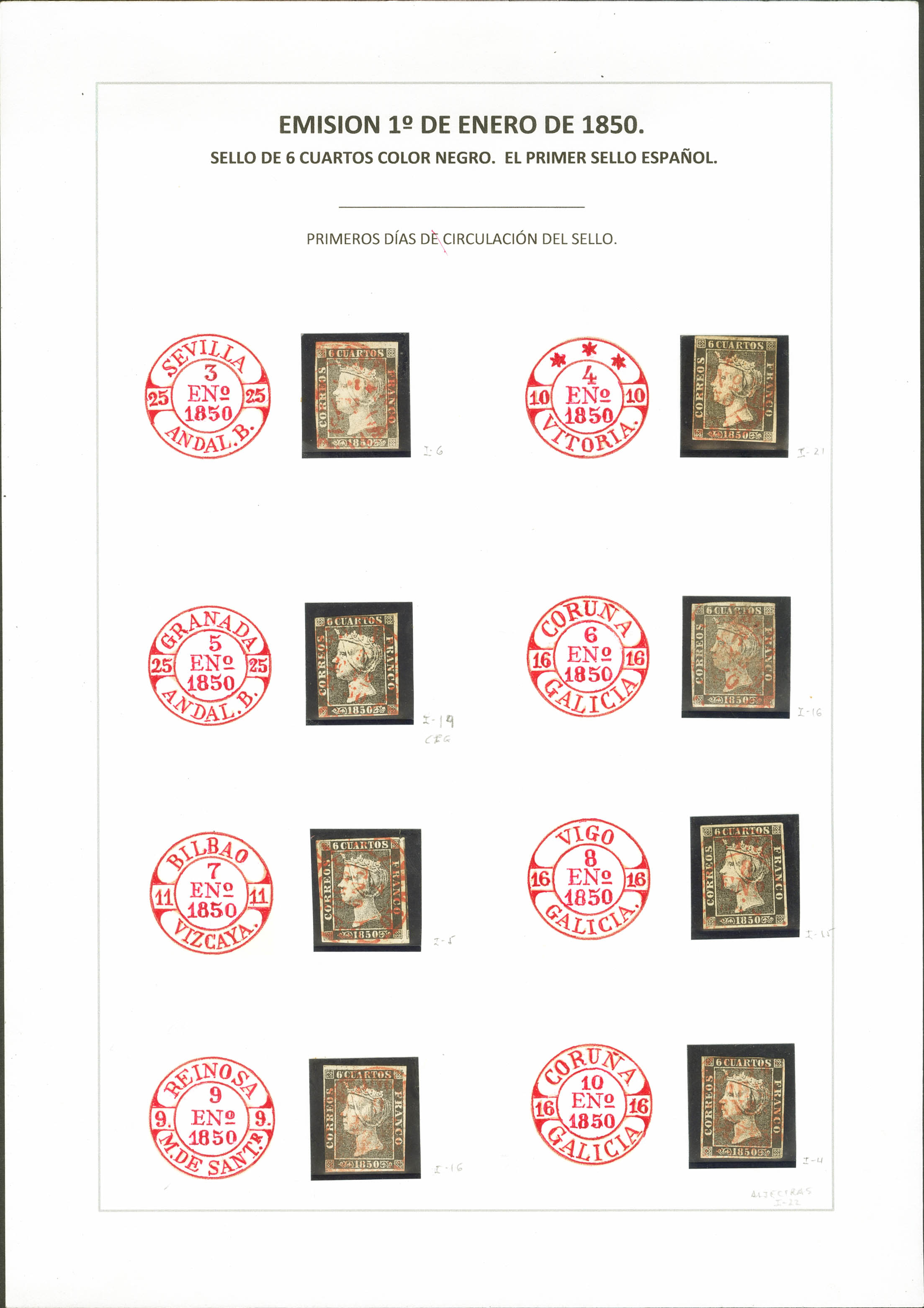 1(8). 1850. Set of eight stamps of the 6 black cuartos of the first days of circulation on the following cities: SEVILLA (day 3), VITORIA (day 4), GRANADA (day 5), CORUÑA (day 6), BILBAO (day 7) , VIGO (day 8), REINOSA (day 9) and ALGECIRAS (day 10), all disabled with the baeza postmark. MAGNIFICENT SET OF THE USE OF THE BAEZA IN THE FIRST DAYS OF CIRCULATION, WITHOUT JANUARY 1 AND 2. Cert. GRAUS (Grenada).