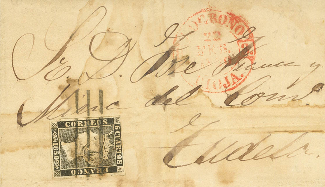 1. 1850. 6 cuartos black (I-2). LOGROÑO to TUDELA (NAVARRA) (moisture stains). Postmark BARS DE LOGROÑO, in black. MAGNIFICENT AND RARE. Cert GRAUS.