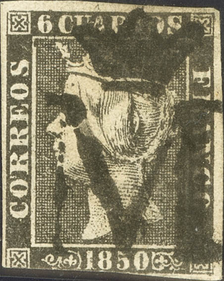 1. 1850. 6 cuartos black. Madrid pre-philatelic "M" Coronada postmark, in black. MAGNIFICENT AND RARE, ESPECIALLY WITH THIS EXCEPTIONAL PRINTING. Cert. COMEX.