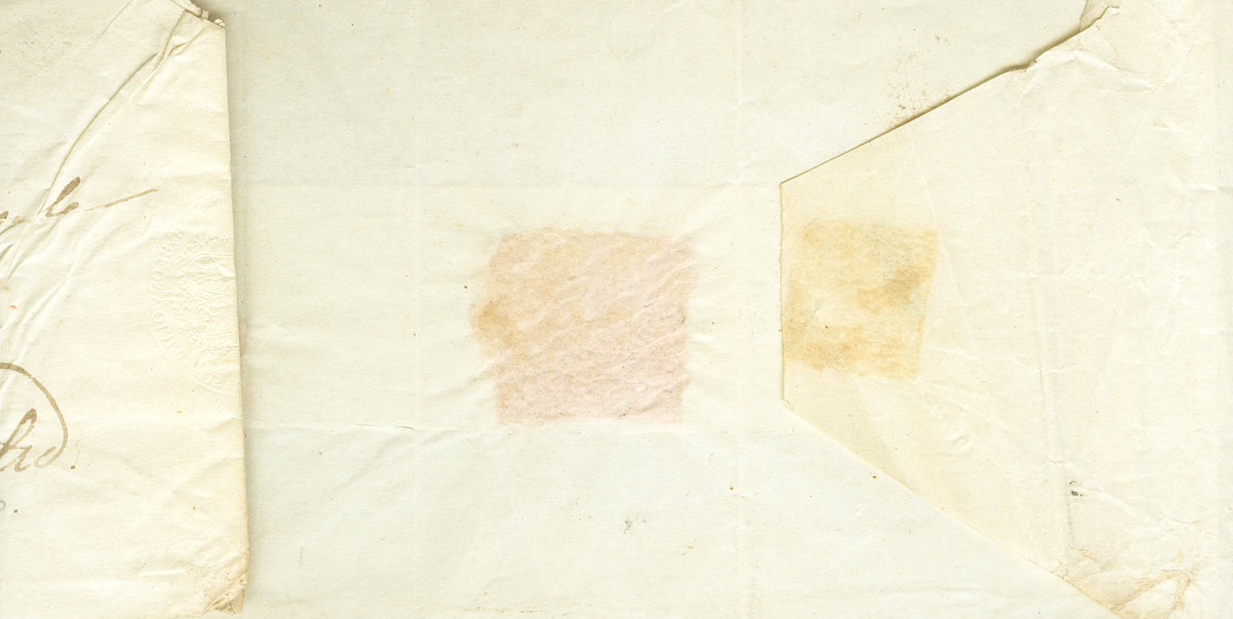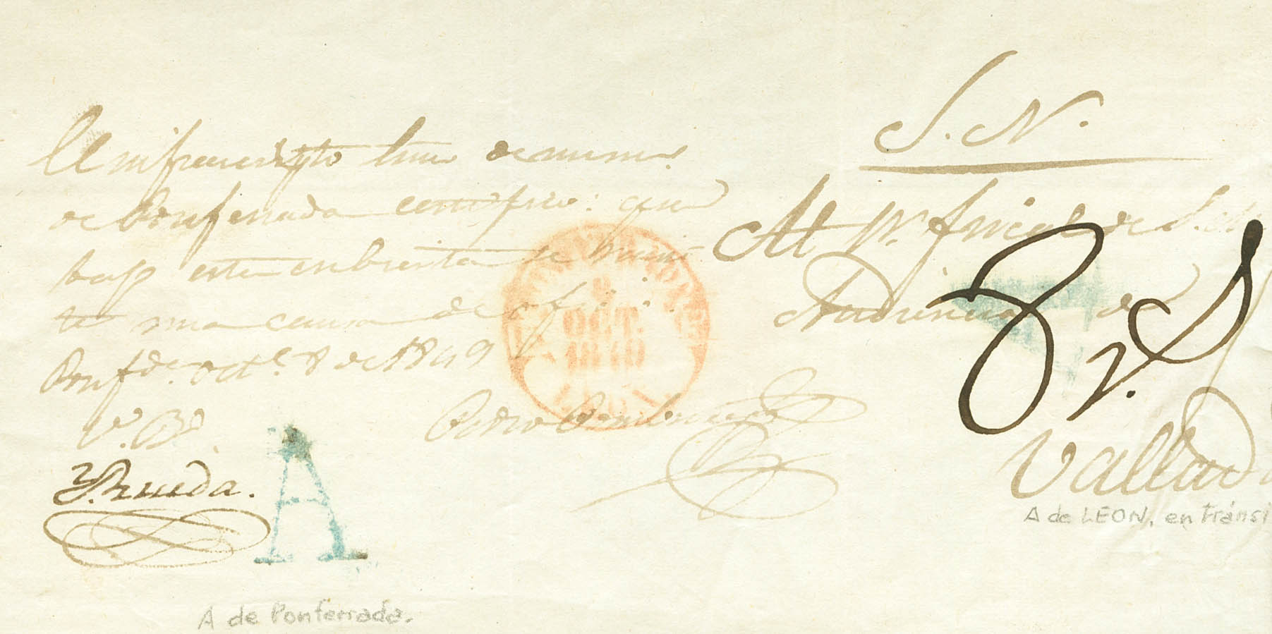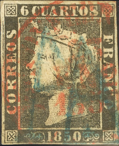 1A. 1850. 6 black cuartos (I-9). Subscription postmark "A", in blue and double stamping of Ponferrada and baeza PONFERRADA / 23-ENE-1850 / LEON. MAGNIFICENT AND EXTRAORDINARY RARE, ONLY THIS PIECE AND ONE LETTER ARE KNOWN (a pre-philatelic letter is attached to compare the brand). Cert. THANKS.