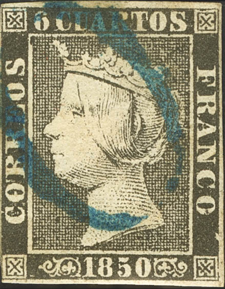 1. 1850. 6 cuartos black (I-15). Cancellation "0", in Lleida blue. MAGNIFICENT AND RARE. Cert. THANKS.