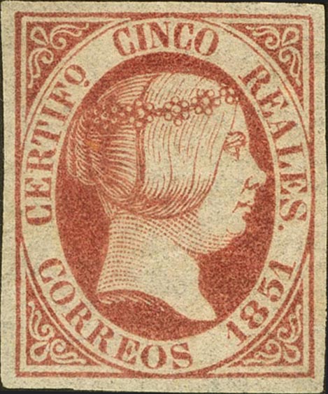 (★) 9. 1850. 5 reales rose (faint color, possibly a washed out spot). Huge margins. MAGNIFICENT. Cert. EMF.