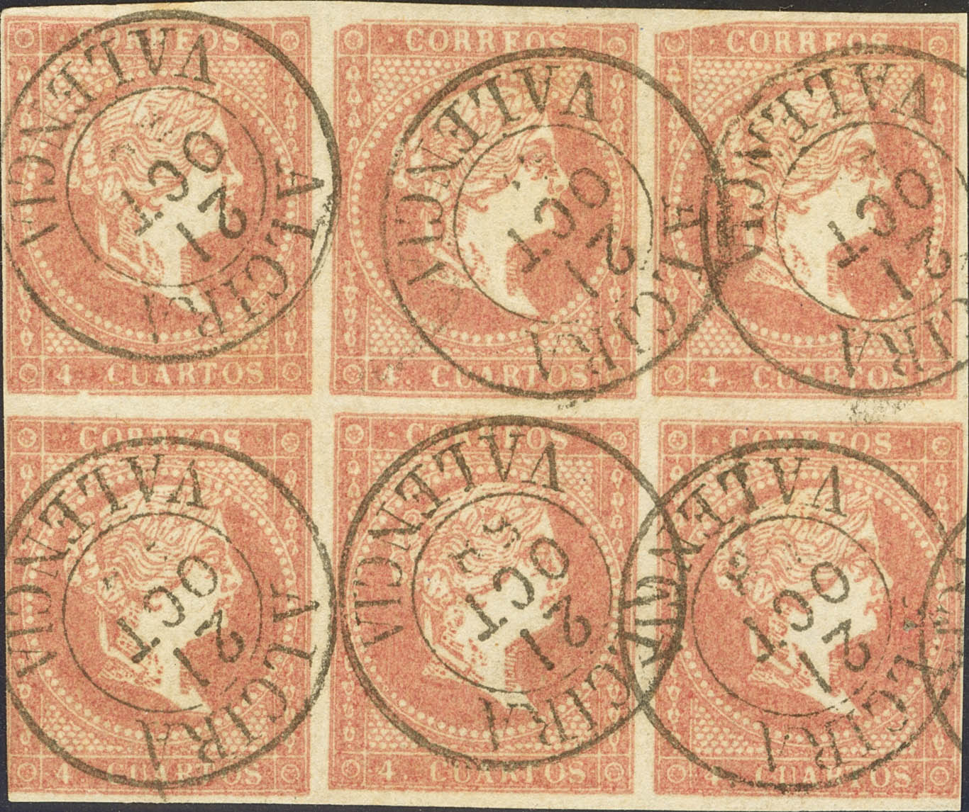 48(6). 1858. 4 red cuartos , block of six. Postmark ALCIRA / VALENCIA (Type I). MAGNIFICENT AND SPECTACULAR PRINTING.