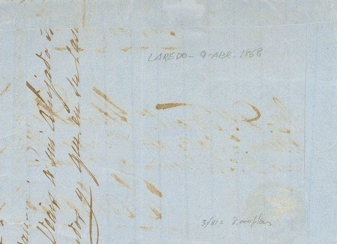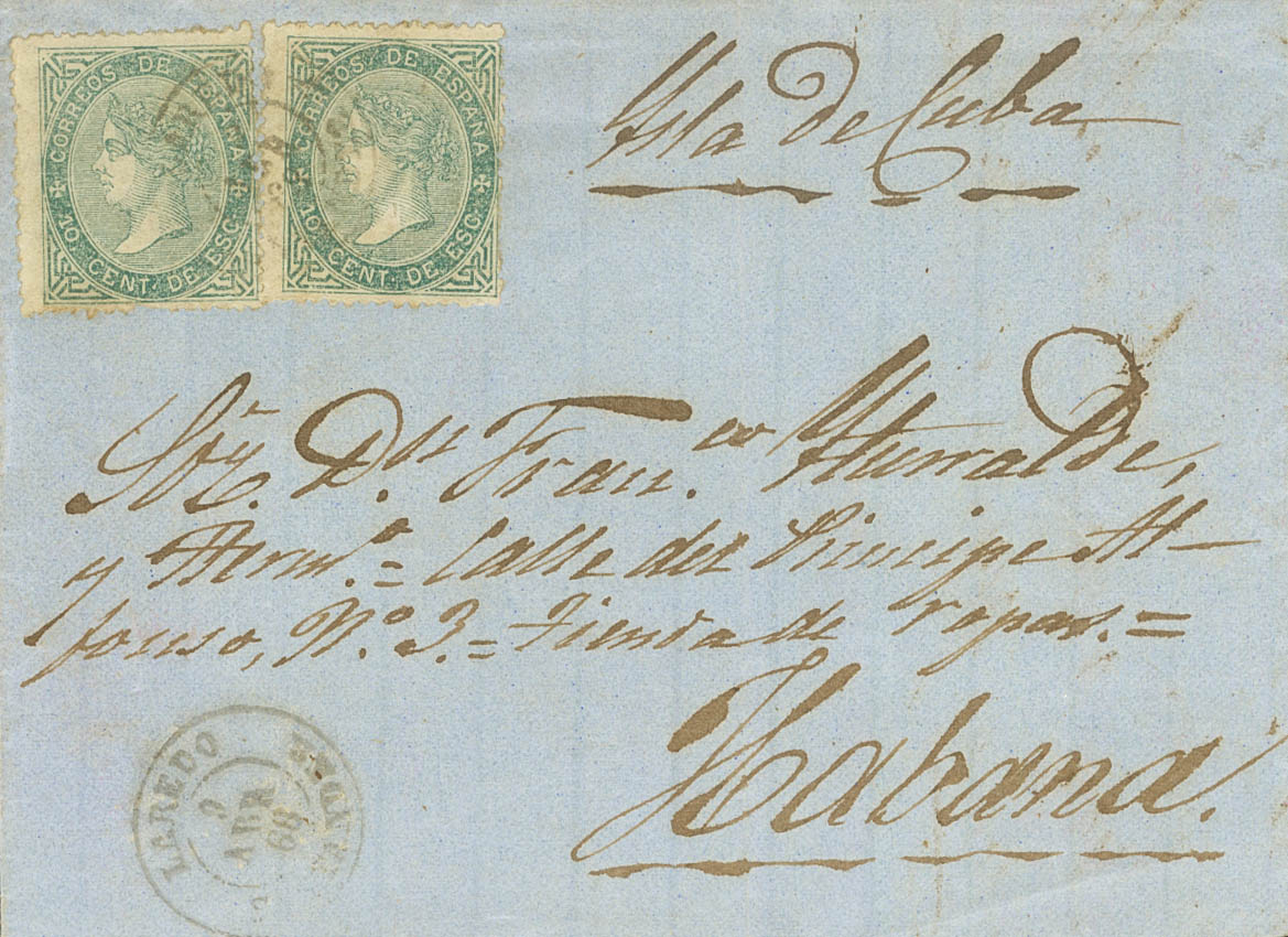 91(2). 1868. 10 cts green, two stamps. Frontal from LAREDO to HAVANA (CUBA). Postmark LAREDO / SANTANDER. MAGNIFICENT AND RARE DOUBLE POSTAGE TO CUBA.