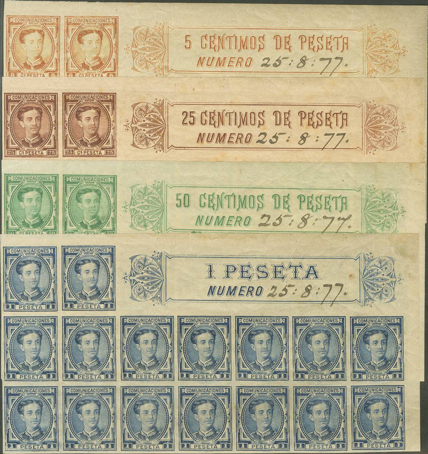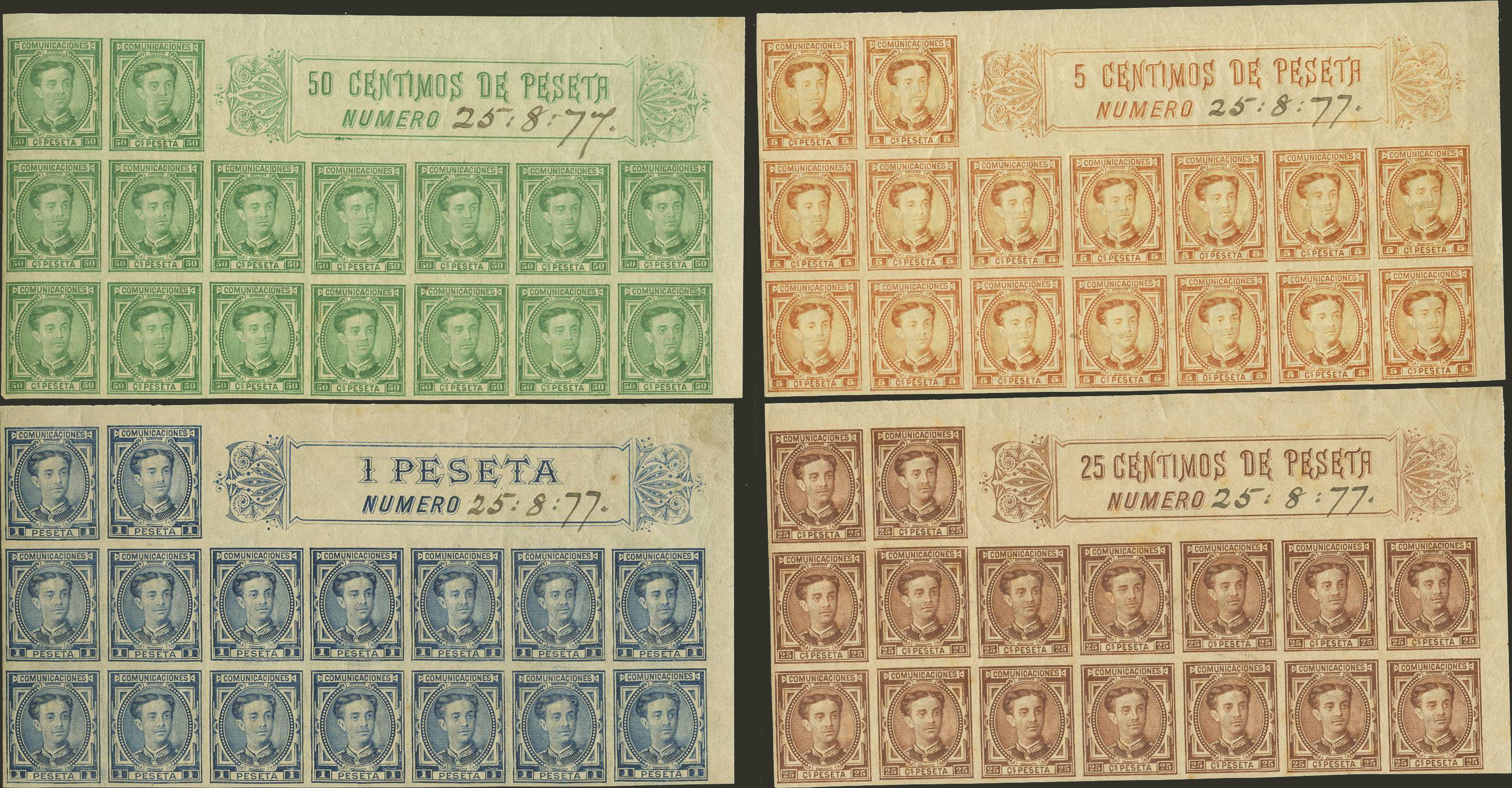 English 174s, 177s, 179s, 180s. 1876. 5 sepia cts, 25 chestnut cts, 50 green cts and 1 blue cts, in blocks of sixteen, numbered sheet header. WITHOUT DENTARTING. MAGNIFICENT AND UNUSUAL SET, TRULY SPECTACULAR. Cert. THANKS. Edifil 2020: +++1,928 Euros