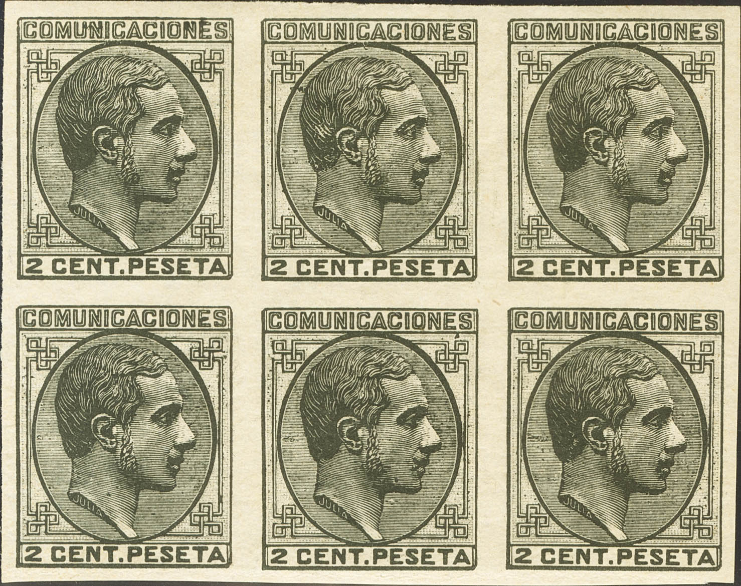 ★★/★ 190ecs(6). 1878. 2 black cts, block of six. COLOR MISTAKE and IMPERFORTING. MAGNIFICENT AND RARE BLOCK. Edifil 2020: ++510 Euros