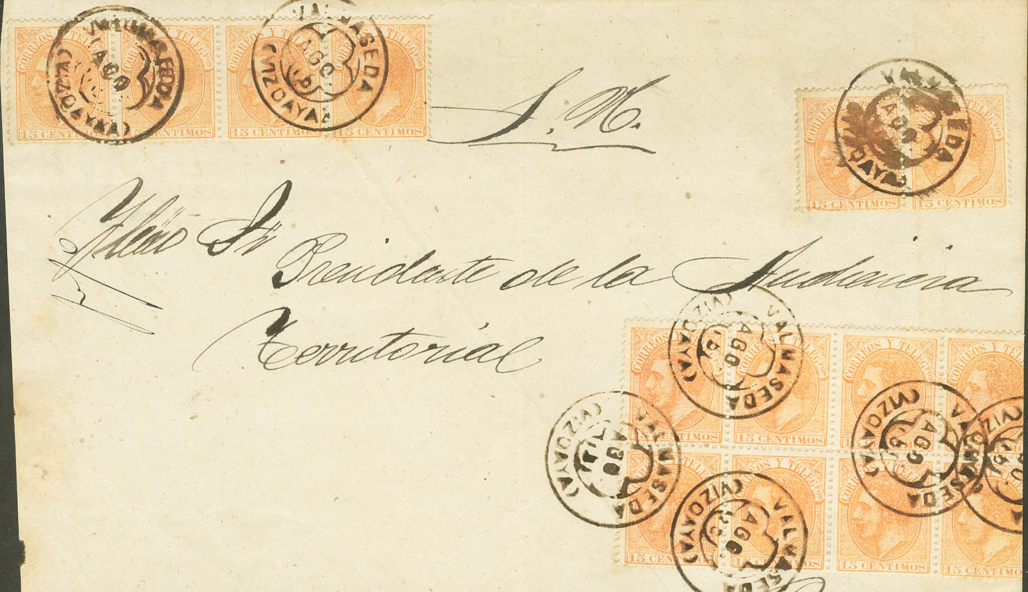 210(14). 1885. 15 cts orange, fourteen stamps (two with a cut in the right margin), fragmented envelope of Judicial Escrow. Clover postmark VALMASEDA / (VIZCAYA), in writing ink (no day on the date block). MAGNIFICENT AND RARE.
