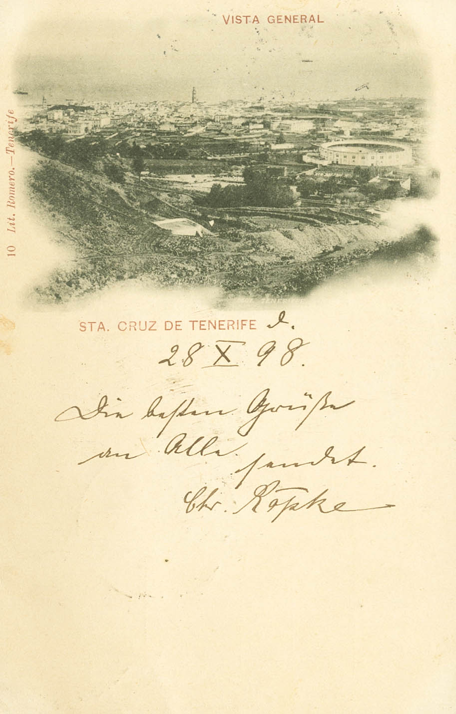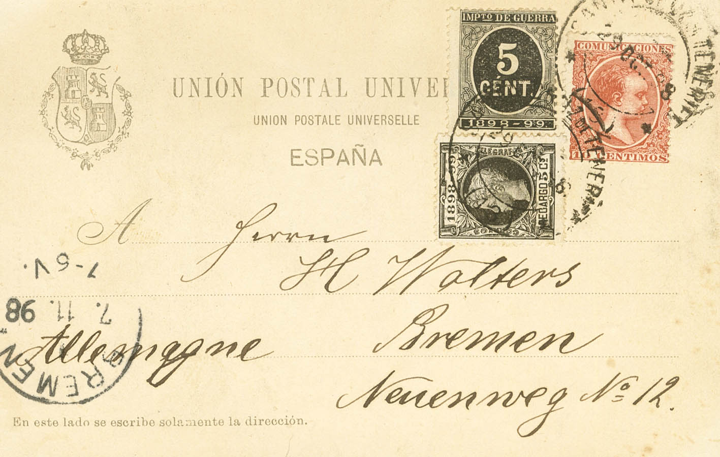 217, 236, 240. 1898. 10 yellow chestnut cts and two black 5 cts War Tax stamps (different issues). Postcard from SANTA CRUZ DE TENERIFE to BREBEN (GERMANY). The War Tax stamps were not valid on correspondence abroad, but since it was correctly franked with 10 cts (according to the April 1888 rate), it was not valued. MAGNIFICENT AND RARE.