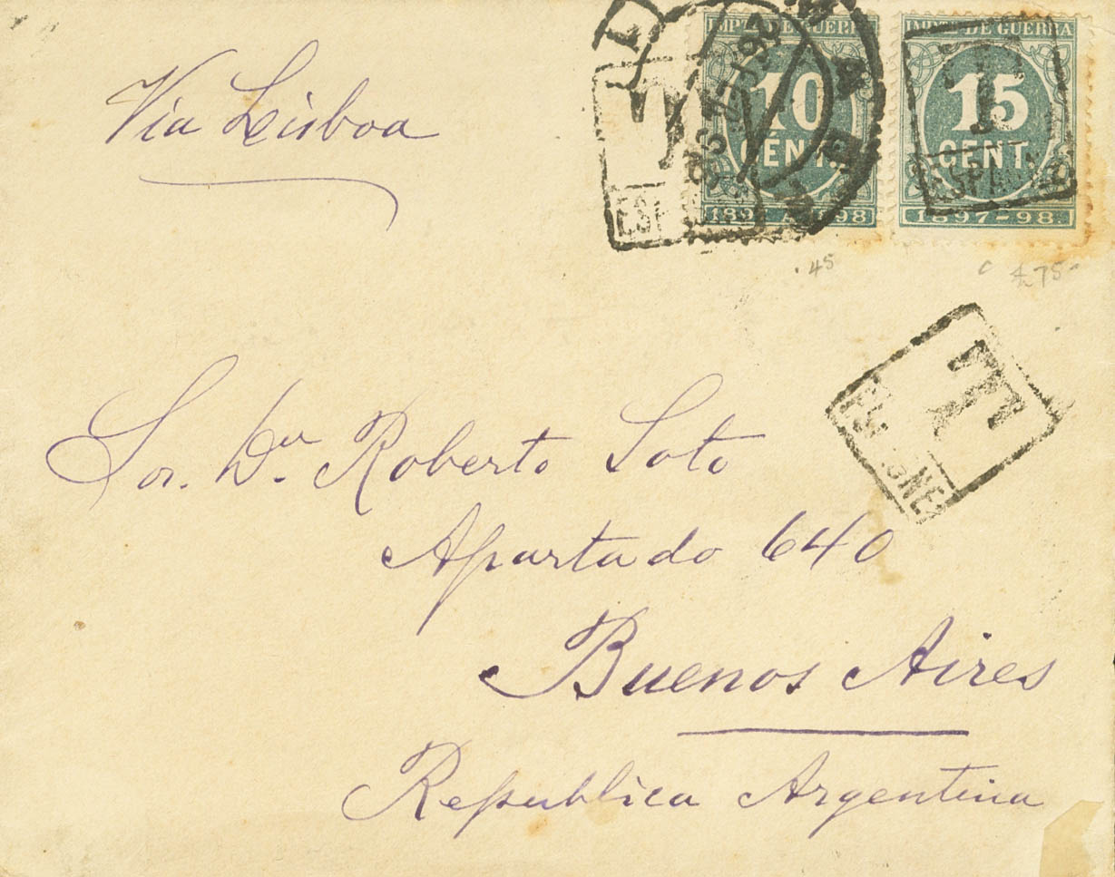 233, 234. 1898. 10 green cts and 15 green cts. Front from MADRID to BUENOS AIRES (ARGENTINA). MADRID / (1) postmark and T / ESPAGNE tax mark on each stamp, applied due to lack of postage. MAGNIFICENT AND VERY RARE FRONT FRONT WITH TWO WAR TAX STAMPS IN ADDITION TO INSUFFICIENT POSTAGE.