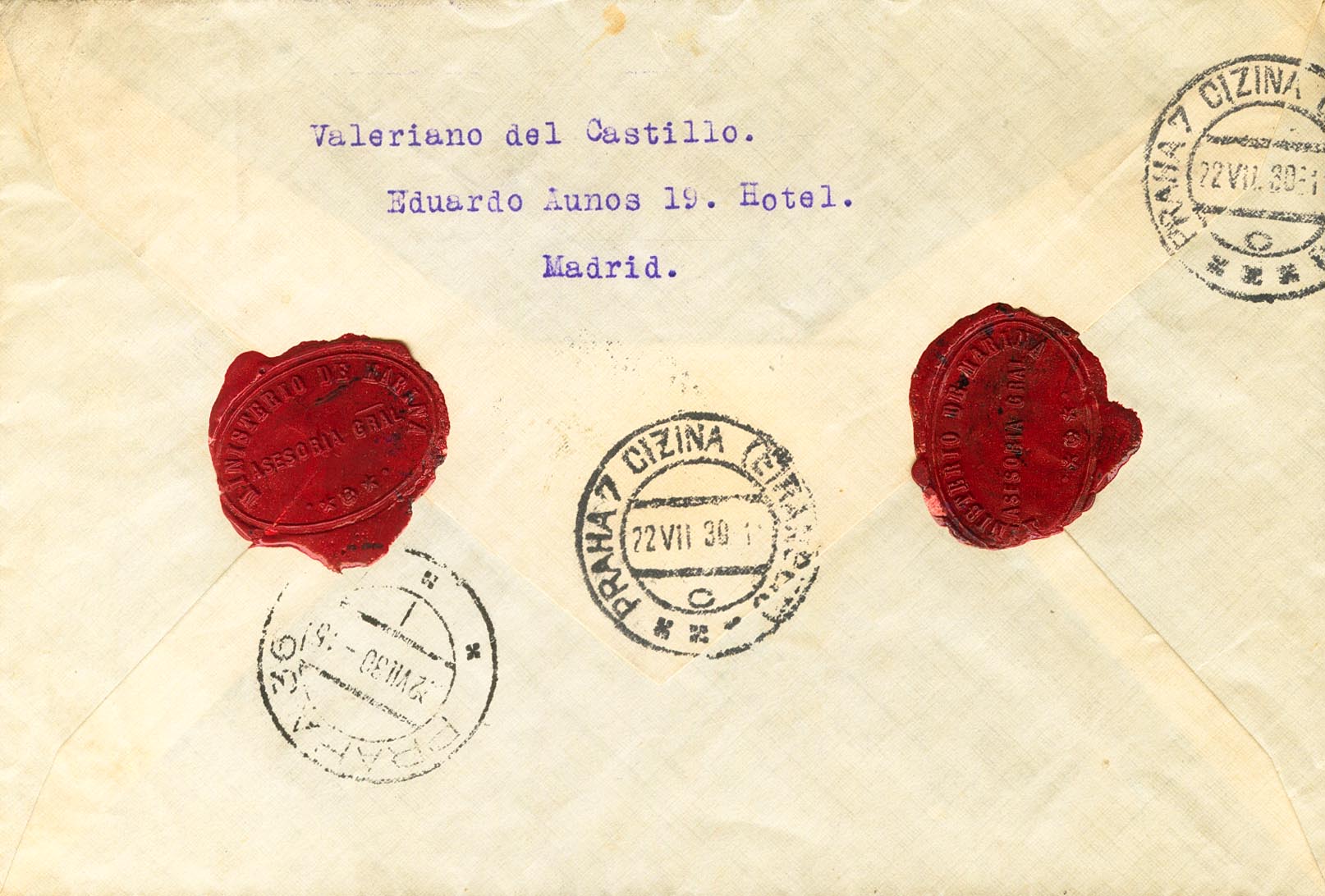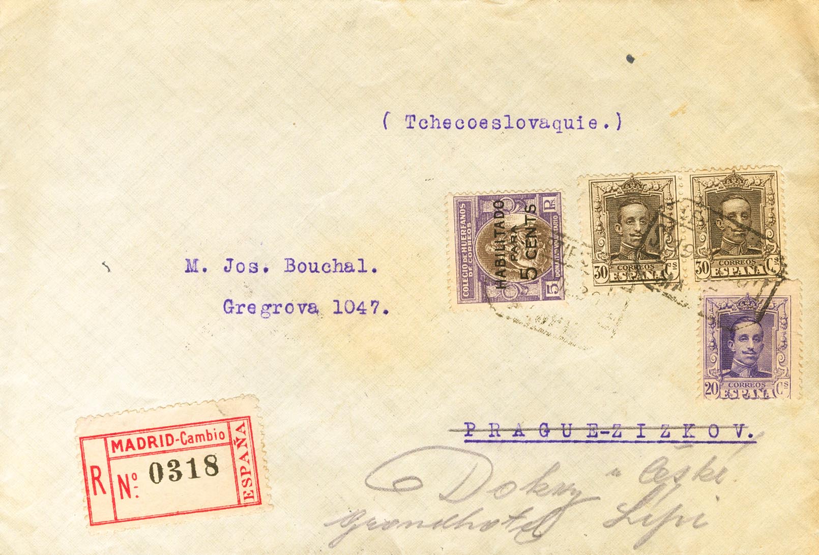316, 318(2). 1930. 20 lilac cts, 30 chestnut cts, couple and 5 cts from Charity. Certificate from MADRID to PRAGUE (CZECHOSLOVAKIA). On the back arrival. MAGNIFICENT AND RARE POSTAGE.