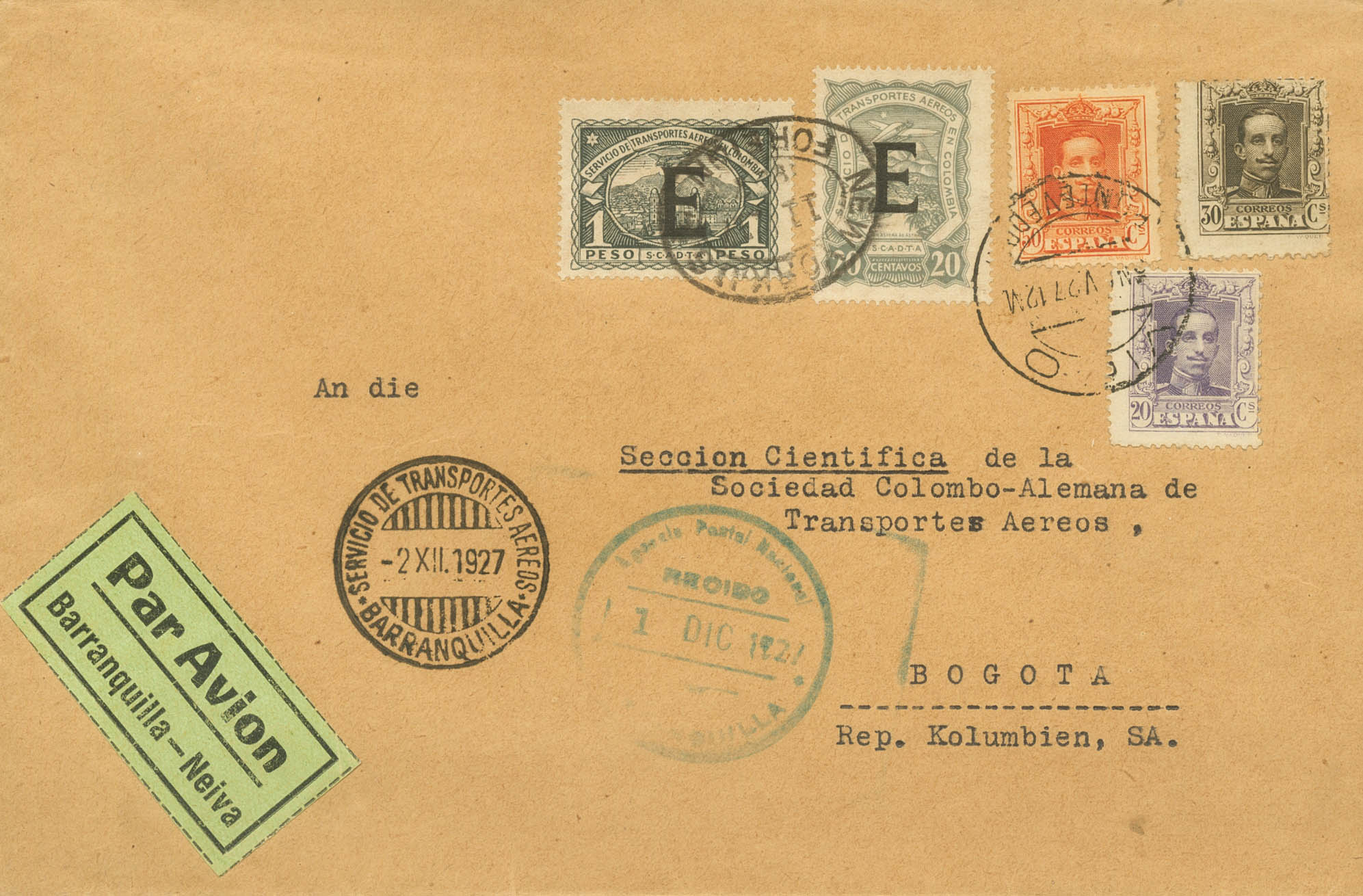 316, 318, 320. 1927. 20 violet cts, 30 brown cts, 50 orange cts and Colombian stamps with consular surcharge "E" of 20 gray cts and 1 black peso. Air Mail from VIGO to BOGOTA. Postmark NEW YORK / FOREIGN on the Colombian stamps and on the front date SERVICIO DE TRANSPORTES AEREOS / BARRANQUILLA. MAGNIFICENT AND RARE.