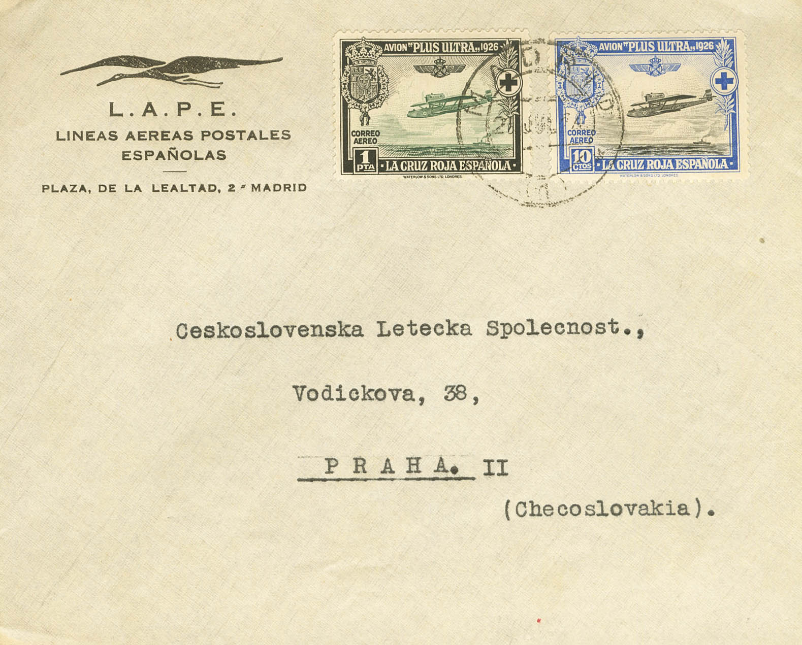 340, 347. 1934. 10 cts blue and black and 1 pts black and green. Cover with LAPE letterhead from MADRID to PRAGUE (CZECHOSLOVAKIA). MAGNIFICENT.