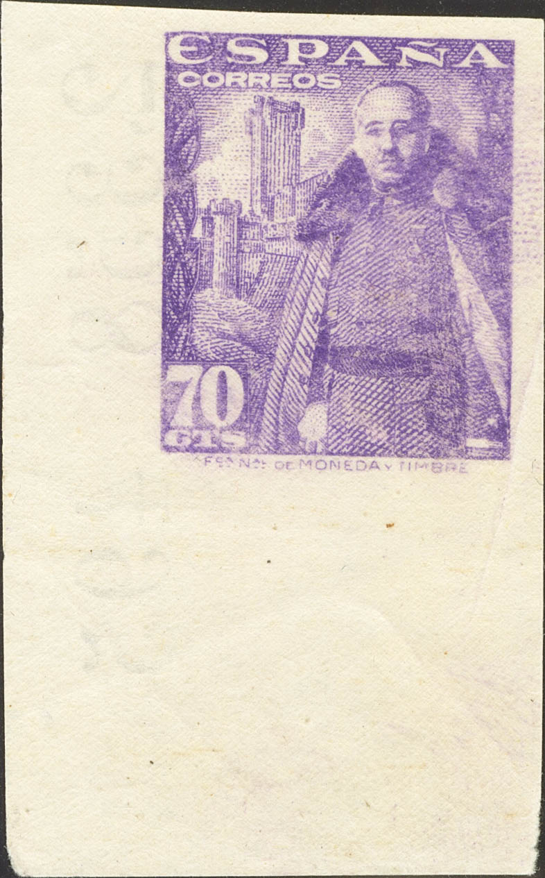 English ★★ 1030s. 1948. 70 cts violet, corner of sheet. IMPERFORATED AND PRINTED ON THE GUM SIDE (this circumstance is most certainly caused by a fold in the paper at the time of printing). MAGNIFICENT AND VERY RARE, NOT REVIEWED, NO MORE THAN TWO OR THREE KNOWN PIECES. Cert. EMF.