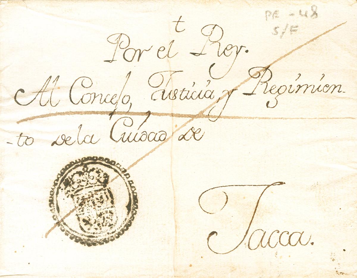 (1794ca). Dirigida a JACA (HUESCA). Marca de Correo Real (P.E.48) edición 2004, trazos de pluma en cruz para indicar franquicia y manuscrito "Por el Rey". MAGNIFICA Y RARISIMA.