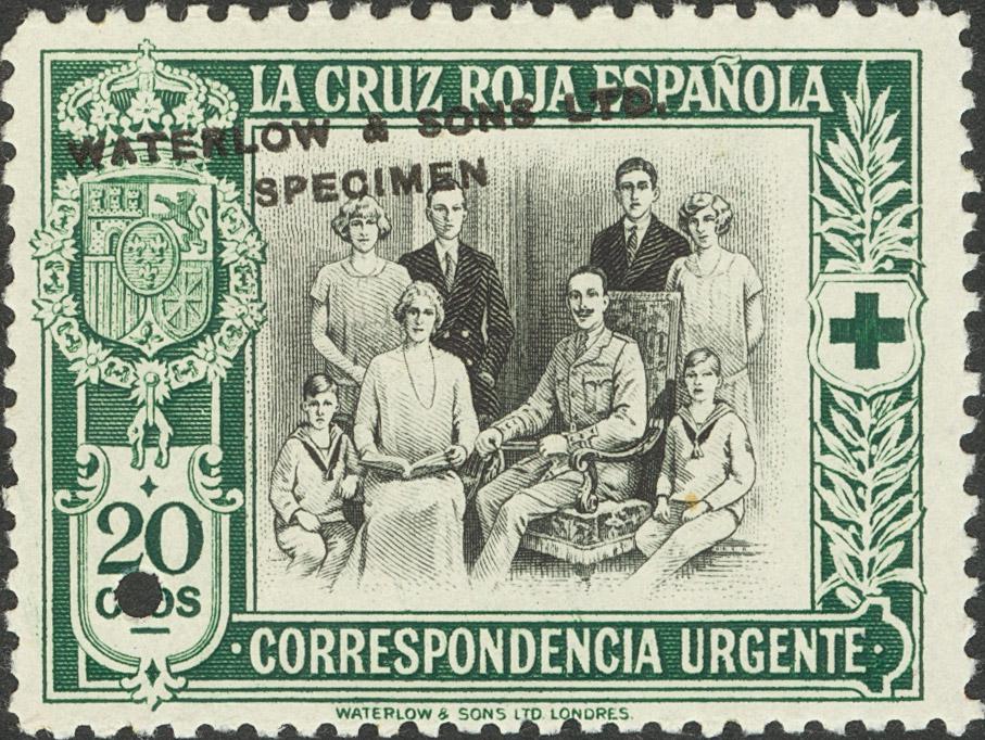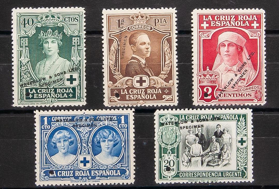 (★) 325/26cMT,333cMT,335cMT,338cMT. 1926. 1 cts azul, 2 cts rosa, 40 cts verde, 1 pts castaño y 20 cts verde y negro. CAMBIOS DE COLOR, con sobrecarga WATERLOW AND SONS LTD / SPECIMEN y taladro. MAGNIFICOS Y VERDADERAMENTE ESPECTACULARES E INUSUALES. Edifil 2020: 265 Euros