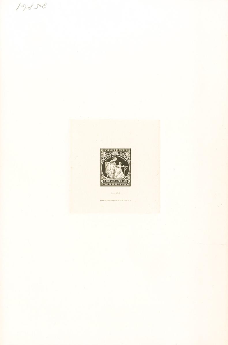 (1920ca). Sin cifra del valor, negro. SOCIEDAD FARMACEUTICA ESPAÑOLA G.FORMIGUERA Y CIª. PRUEBA DE PUNZON, con numeración C-160 y AMERICAN BANK NOTE Cº NY. MAGNIFICA Y RARISIMA.