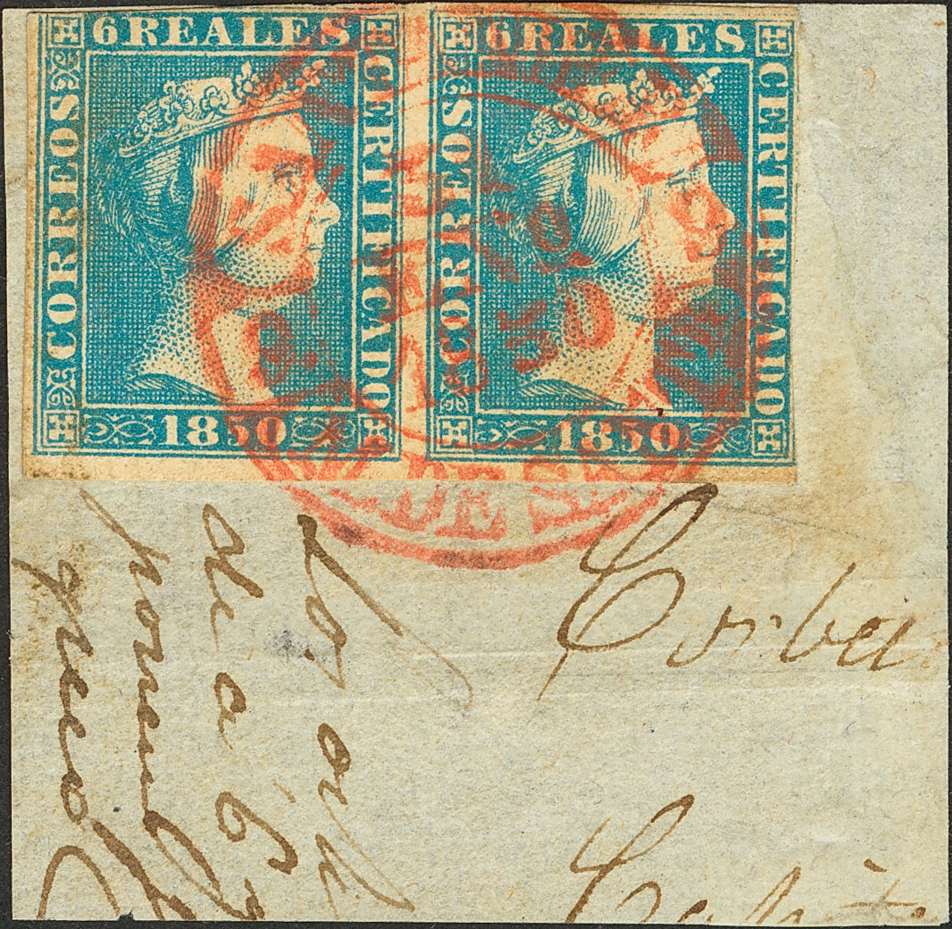 △ 4(2). 1850. 6 blue reales , pair, on fragment. Postmark baeza SANTANDER / M. DE SANT. MAGNIFICENT AND EXTRAORDINARY RARE, ESPECIALLY IN THIS QUALITY. Edifil 2016: +++++3,150 Euros