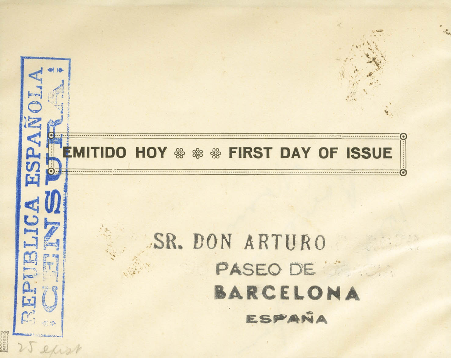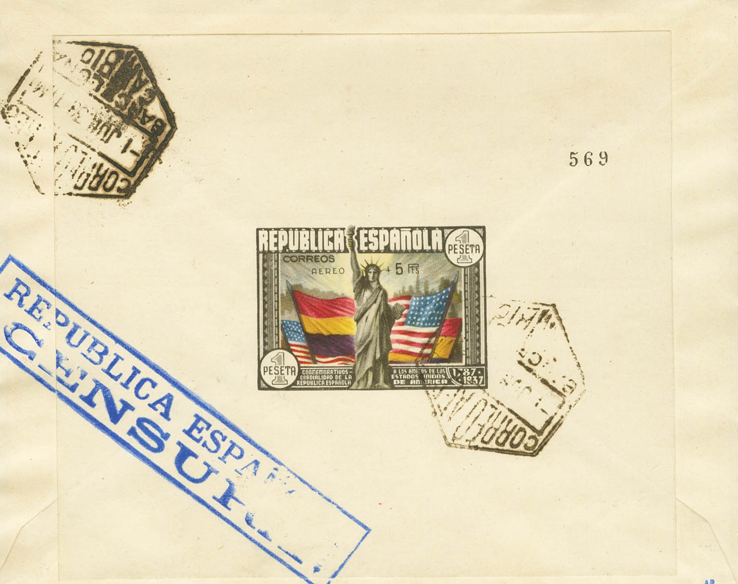 766s. 1938. Block sheet. AERIAL+5 PTS and UNTOOTHED. First Day Cover of the Interior Mail of BARCELONA. MAGNIFICENT AND EXTRAORDINARY RARE, ONLY THREE OR FOUR KNOWN THAT WERE USED AS THE FIRST DAY OF CIRCULATION, AND THEY ARE THE ONLY ONE THAT CAN BE CONSIDERED CIRCULATED, EVEN THOUGH THEY ARE IN A PHILATELIC WAY, THE NUMBERS RESERVED FOR THESE WERE FROM 551 TO 650, NO OTHER CIR SHEETS ASS , AND THOSE THAT EXIST SHOULD ALL BE QUESTIONED. Cert. EMF.