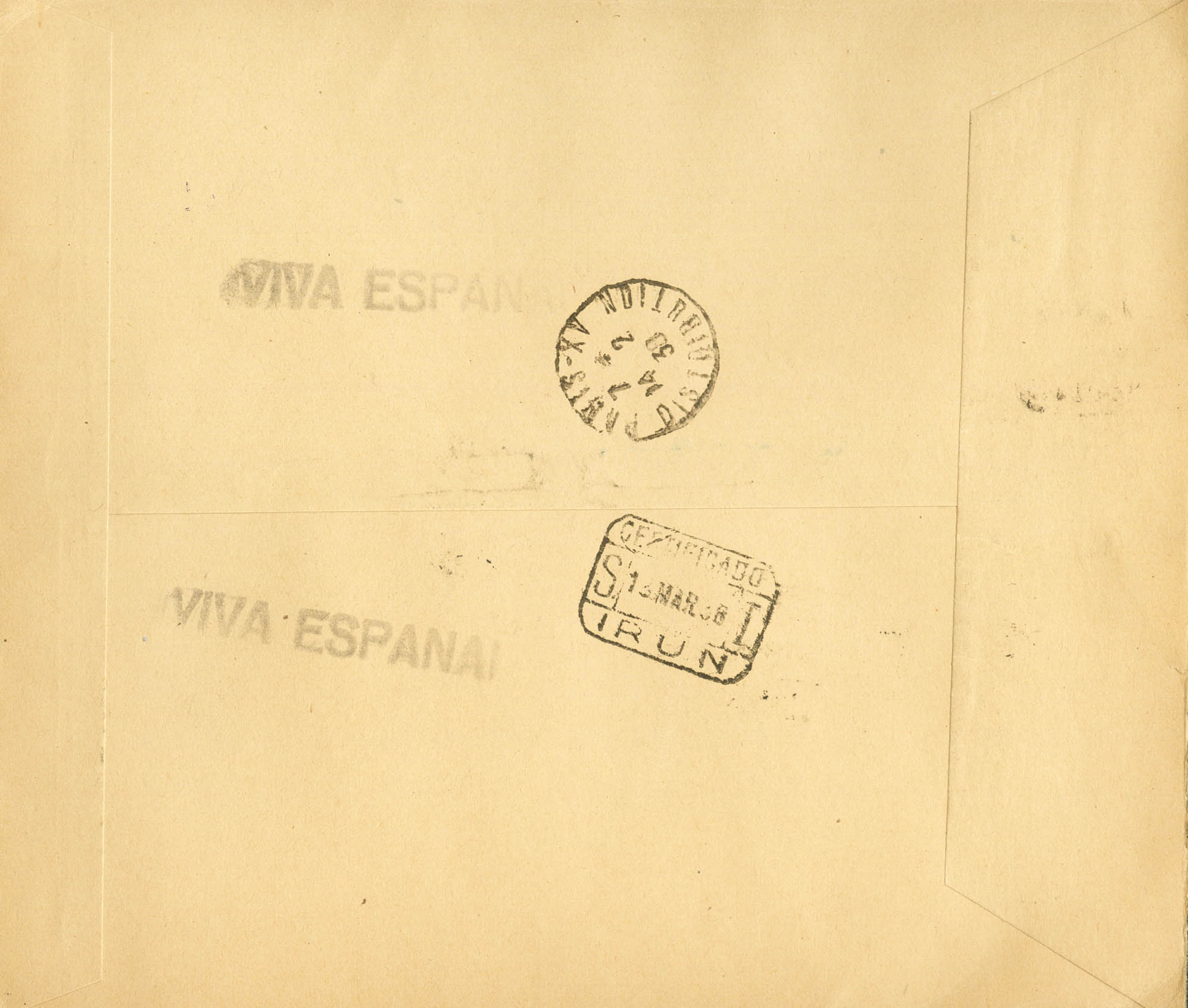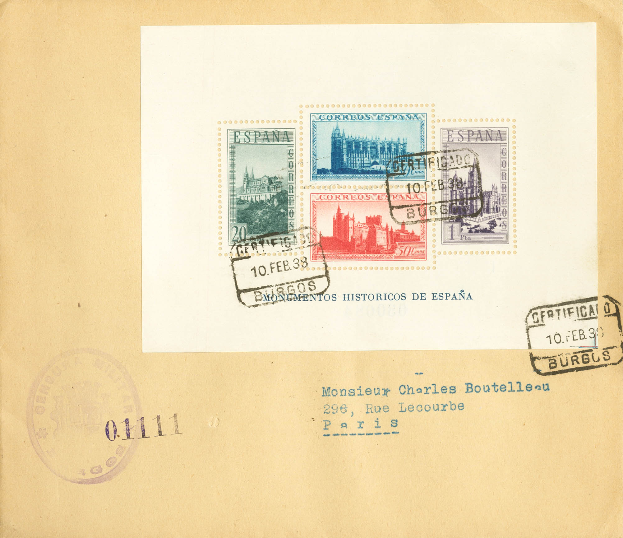 847cc. 1938. Block sheet CHANGED COLORS. Certificate from BURGOS to PARIS. On the back arrival. MAGNIFICENT AND EXTRAORDINARY RARE TRULY CIRCULATED.