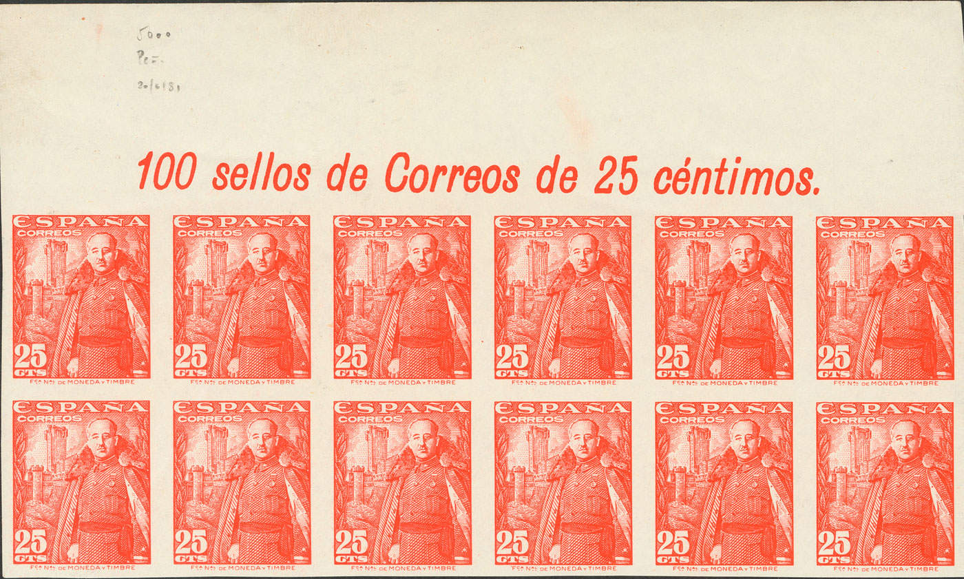 ★★ 1024s(12). 1948. 25 cts red, block of twelve sheet headers. WITHOUT TOOTH. MAGNIFICENT AND VERY RARE, PIECE OF GREAT SPECTACULARITY, WITHOUT ANY OF THE LARGEST BLOCK KNOWN. Edifil 2018: +++1,992 Euros