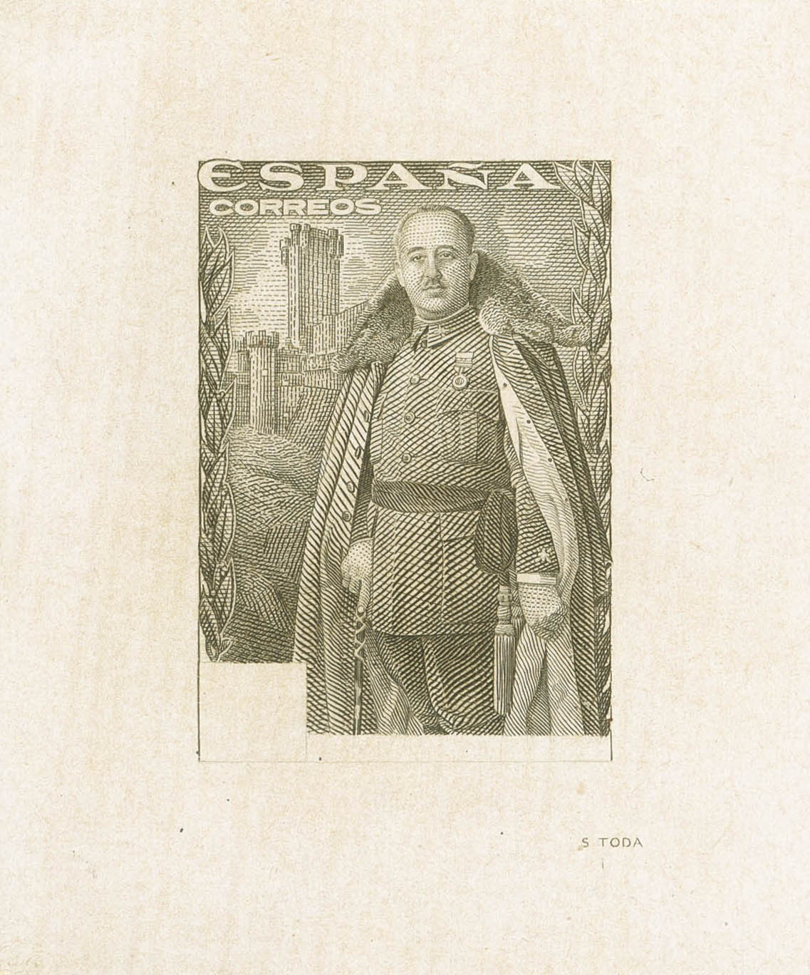 (★)1909. Without value figure, black gray. PUNCH PROOF, of a design not adopted (it was used, in a smaller format for the 1948 issue) with the effigy of Franco and the Castillo de la Mota in large format, with the imprint S.TODA. MAGNIFICENT AND RARE.