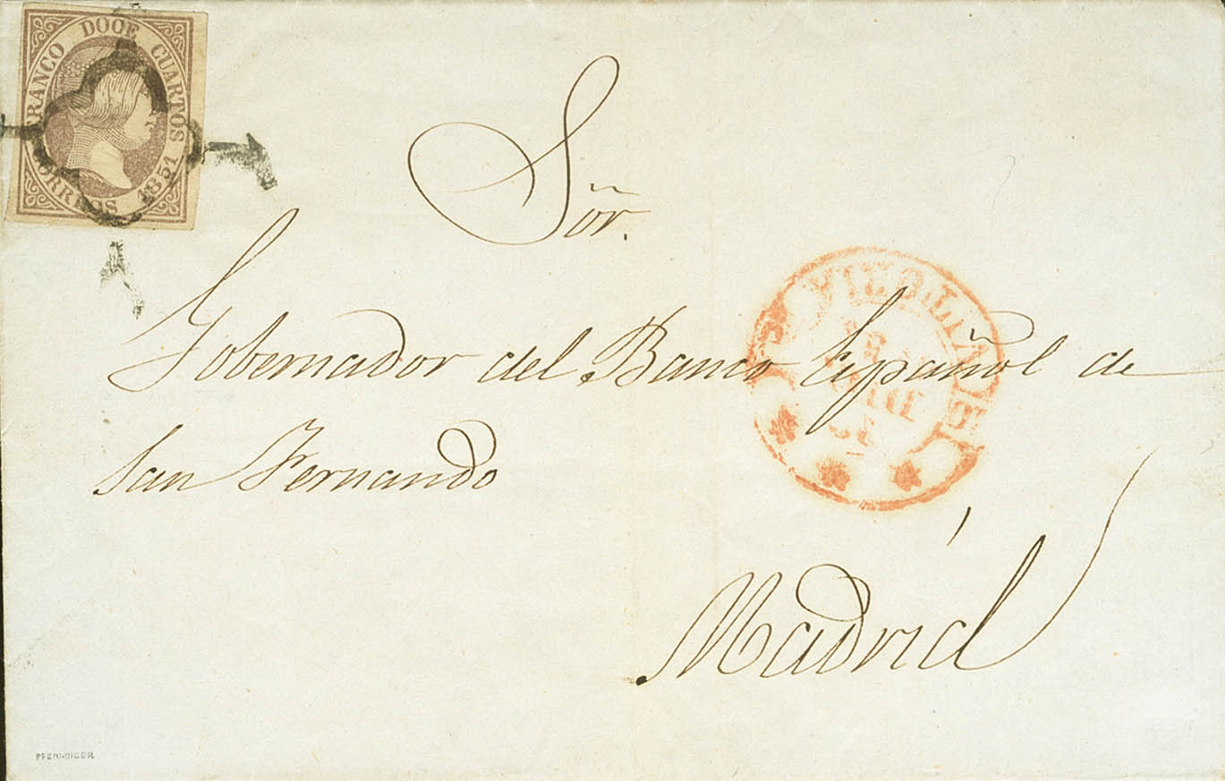 7. 1851. 12 lilac cuartos . VITORIA to MADRID. MAGNIFICENT AND RARE DOUBLE CARRY.